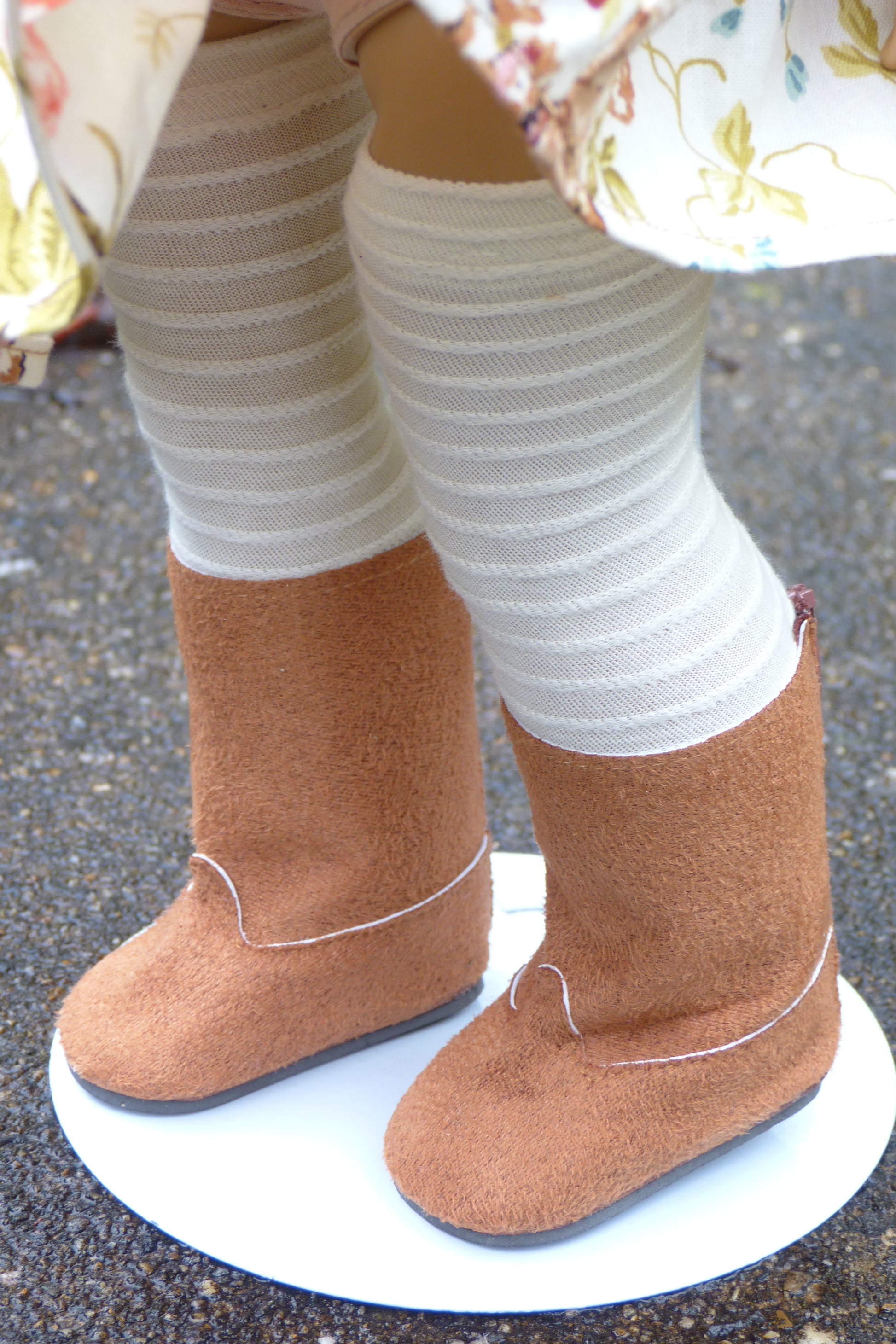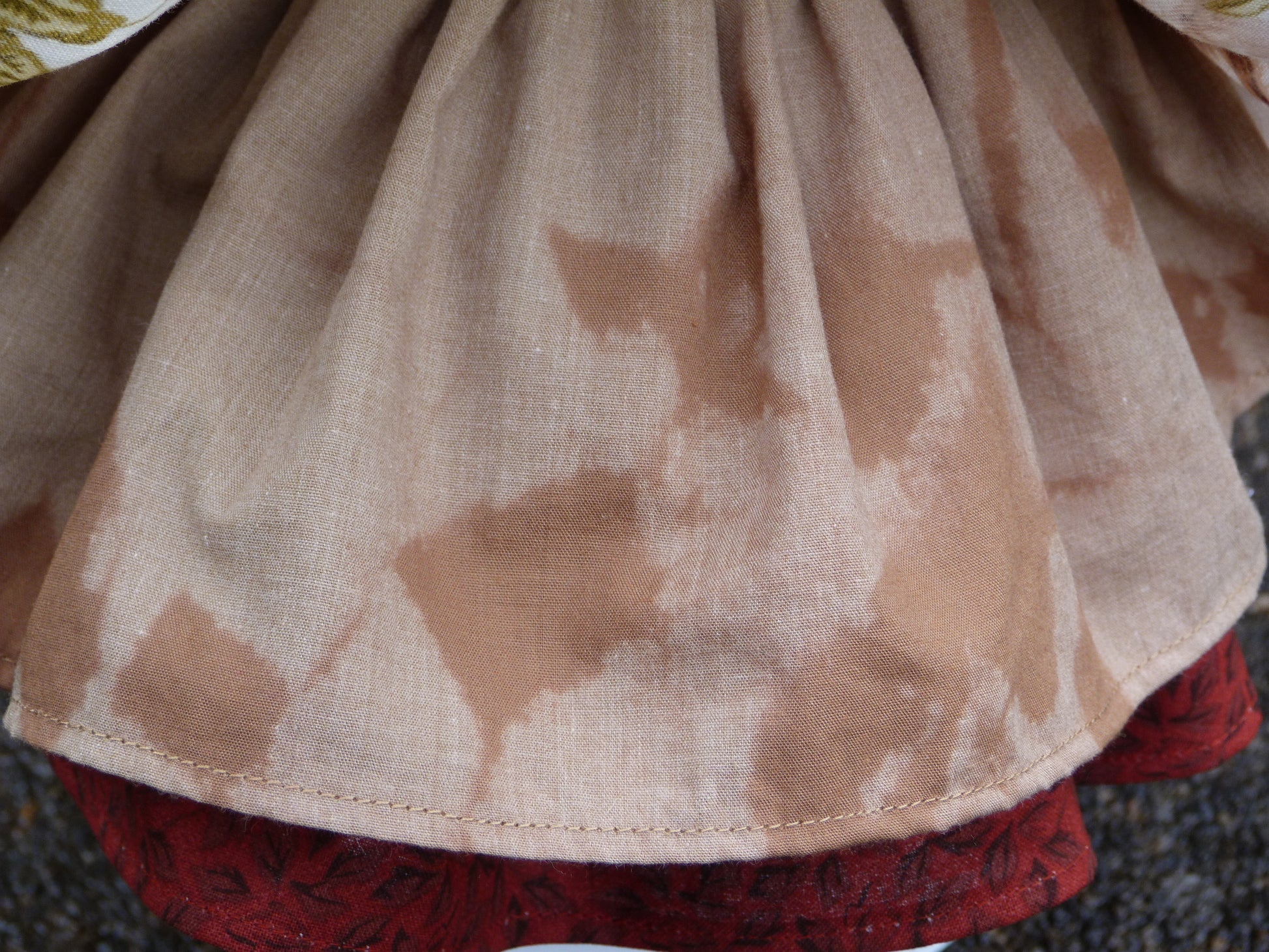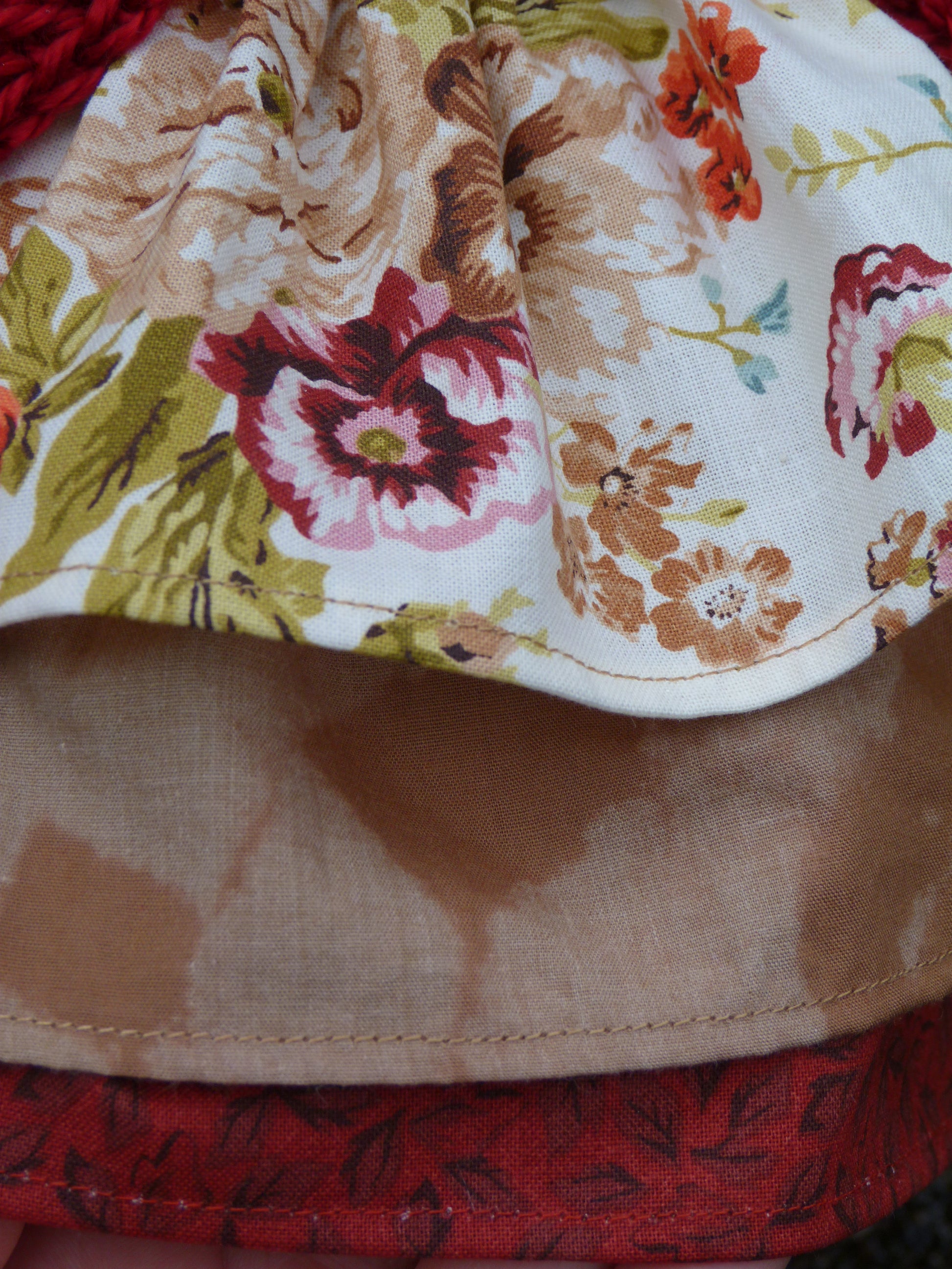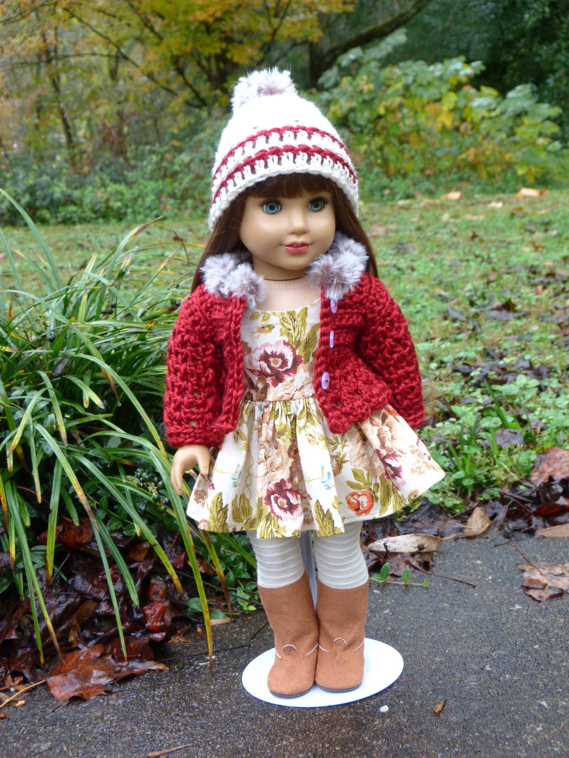 This handmade fall outfit is designed to fit 18 inch AG dolls. The hat and cardigan are crocheted of soft maroon and cream acrylic yarn. They are edged with faux fur. The dress and skirt are sewn of floral cotton fabric. The dress has serged seams and hook/loop closure in back. The skirt has an elastic waistband. The brown tier on the skirt is hand-dyed using real fall leaves as stencils. Cream ridged stretch knit fabric was sewn to create the socks. Her brown faux suede boots are made by American Fashion World.