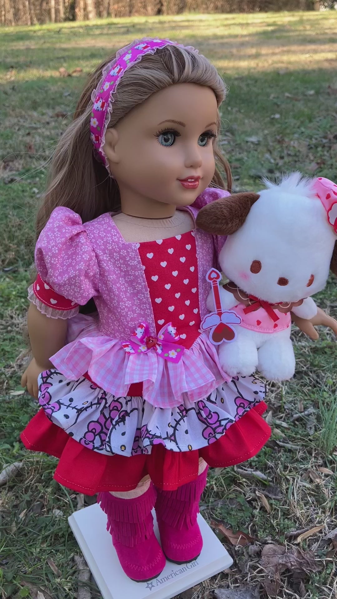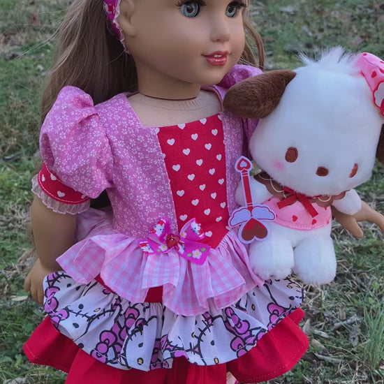 This handmade outfit is designed to fit 18 inch dolls such as AG. The kitty headband is secured in back with elastic. The dress is sewn of cotton fabric featuring floral pinks, gingham, red with hearts, and a Hello Kitty print. This dress has a lined bodice, serged seams, and hook/loop closure. Her pink socks are sewn of stretch knit fabric and edged in organza trim. The fuchsia suede boots close with zippers. Her adorable cupid puppy, Pochacco is included in this set.