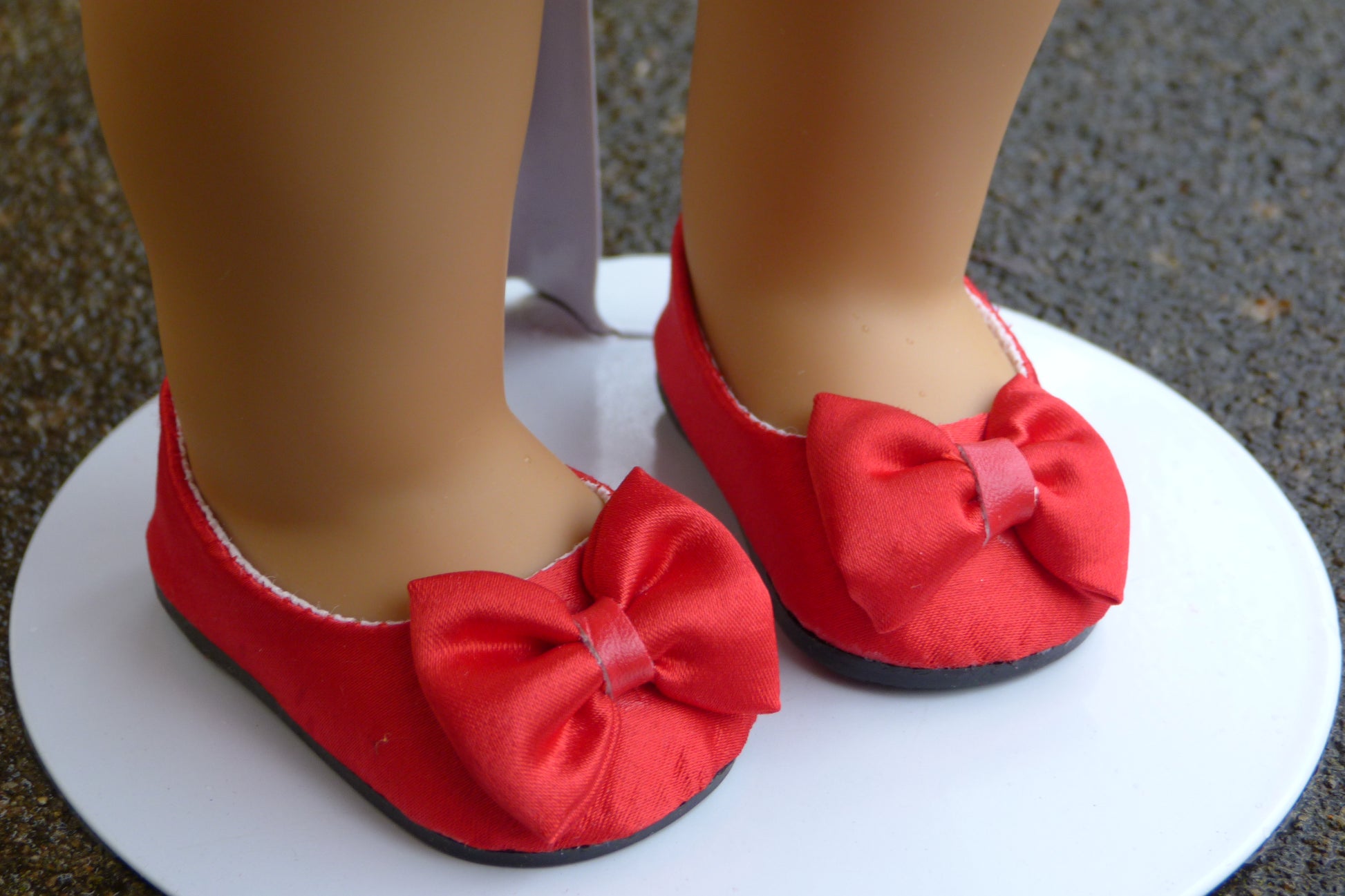 This handmade outfit is designed to fit 18 inch dolls such as AG. The dress is sewn of cotton fabric featuring candy cane stripes and a Christmas kitty print. It has serged seams and hook/loop closure in back. The separate sleeves are secured with elastic. Her matching hair bow is attached to a metal barrette. The red satin bow shoes are Bbeautydolls.com