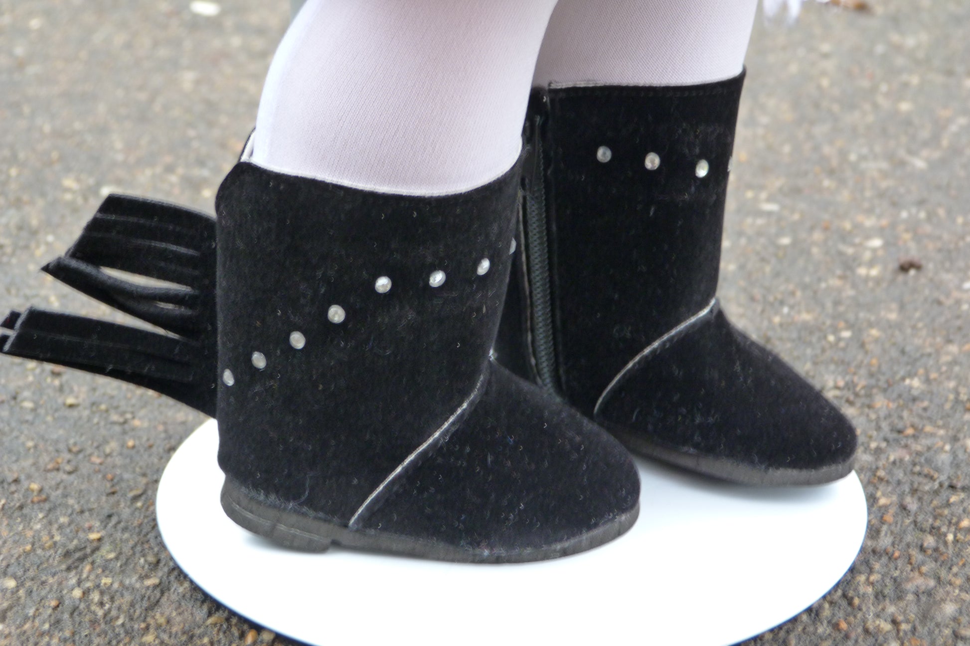 This handmade outfit is designed to fit 18 inch dolls such as AG. The dress and apron are sewn of cotton fabric featuring red/green gingham, white, black, and a Christmas farm animal print. Seams are serged. White lace trim, red velvet ribbon, and black shiny buttons decorate the dress, which has hook and loop closure in back. The red ribbon hair bow has a metal clip. The socks are sewn of white stretch knit fabric. Her black velvet fringe boots close with zippers.