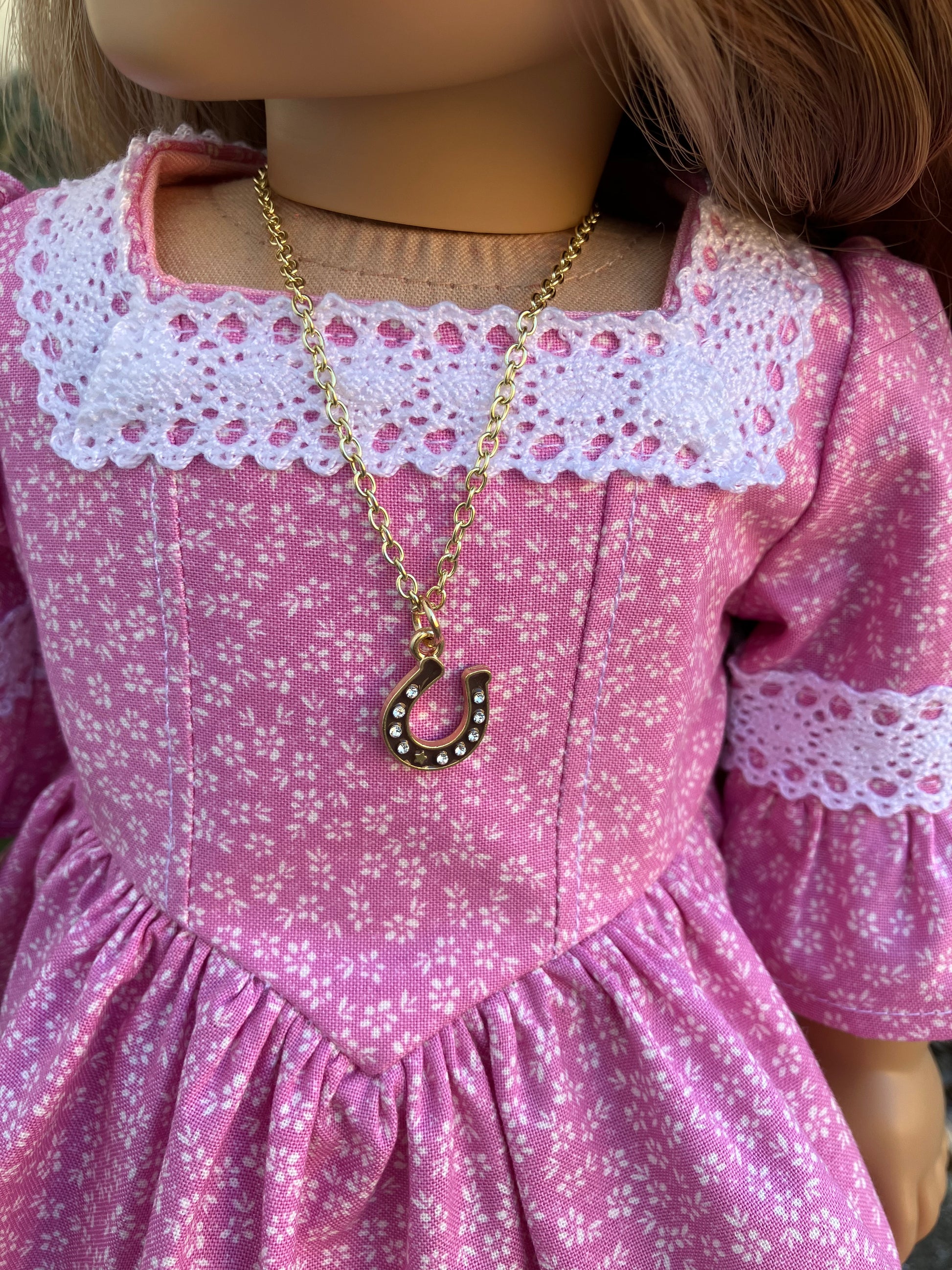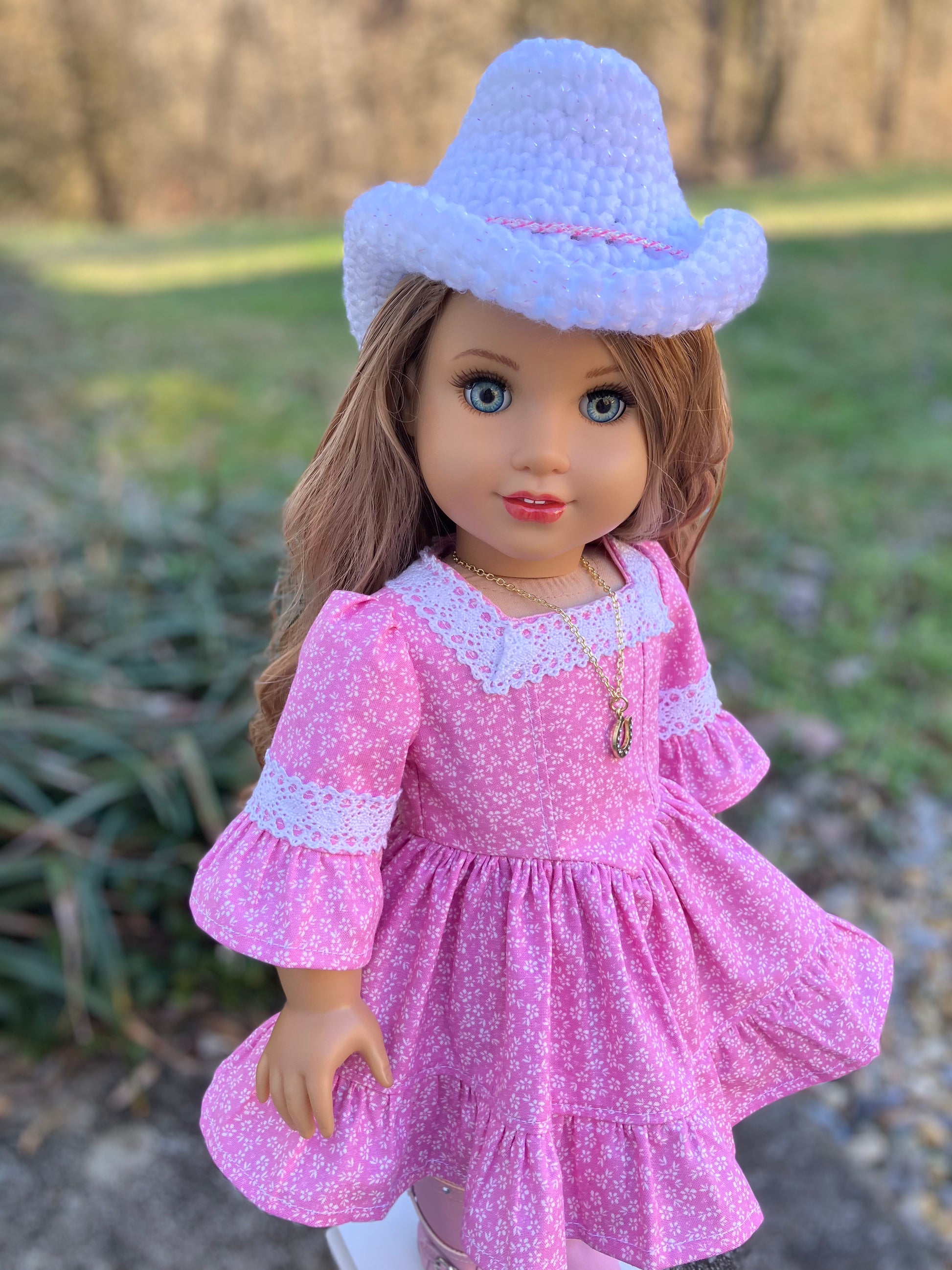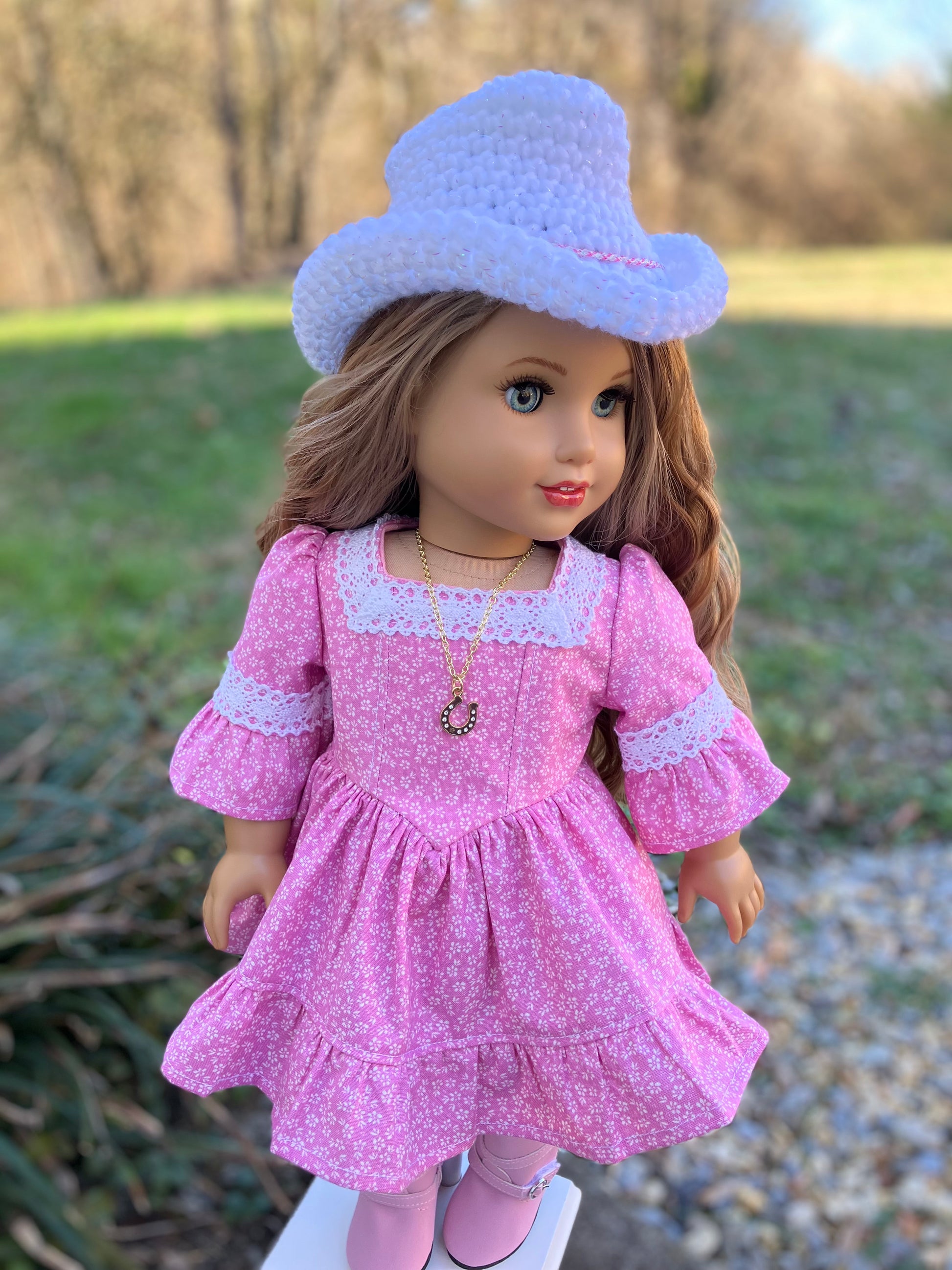 This handmade outfit is designed to fit 18 inch dolls such as AG. Iridescent white acrylic yarn was crocheted to create the cowgirl hat. It is decorated with pink woven cord and a rhinestone star. Her horseshoe necklace closes with a lobster style clasp. The dress is sewn of pink and white floral fabric. The bodice and sleeves are edged in white crocheted trim. This dress has a lined bodice, serged seams, and hook and loop closure. The pink cowgirl boots close with zippers.