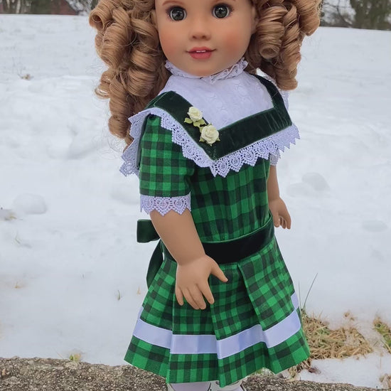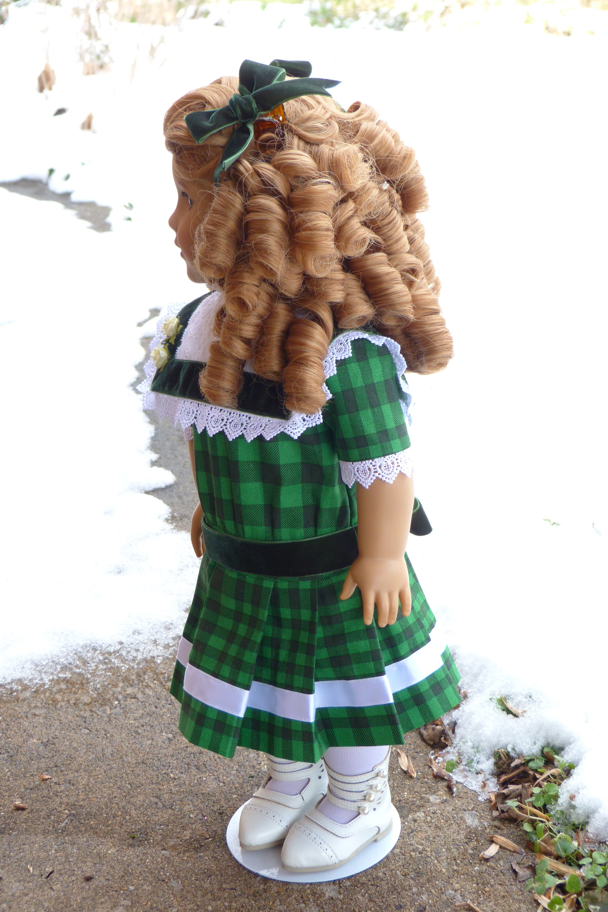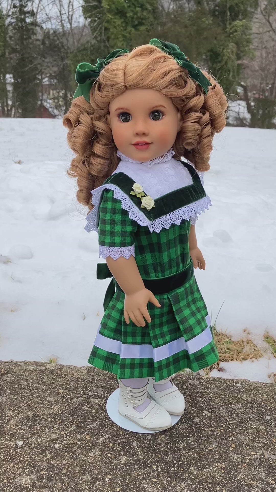 Erin will arrive in her handmade historical outfit, designed especially for her. This ensemble includes green velvet hair bows, lacy collar, and deep green checkered dress with metal snap closure. Also included are her white cotton bloomers, stockings, and shoes.