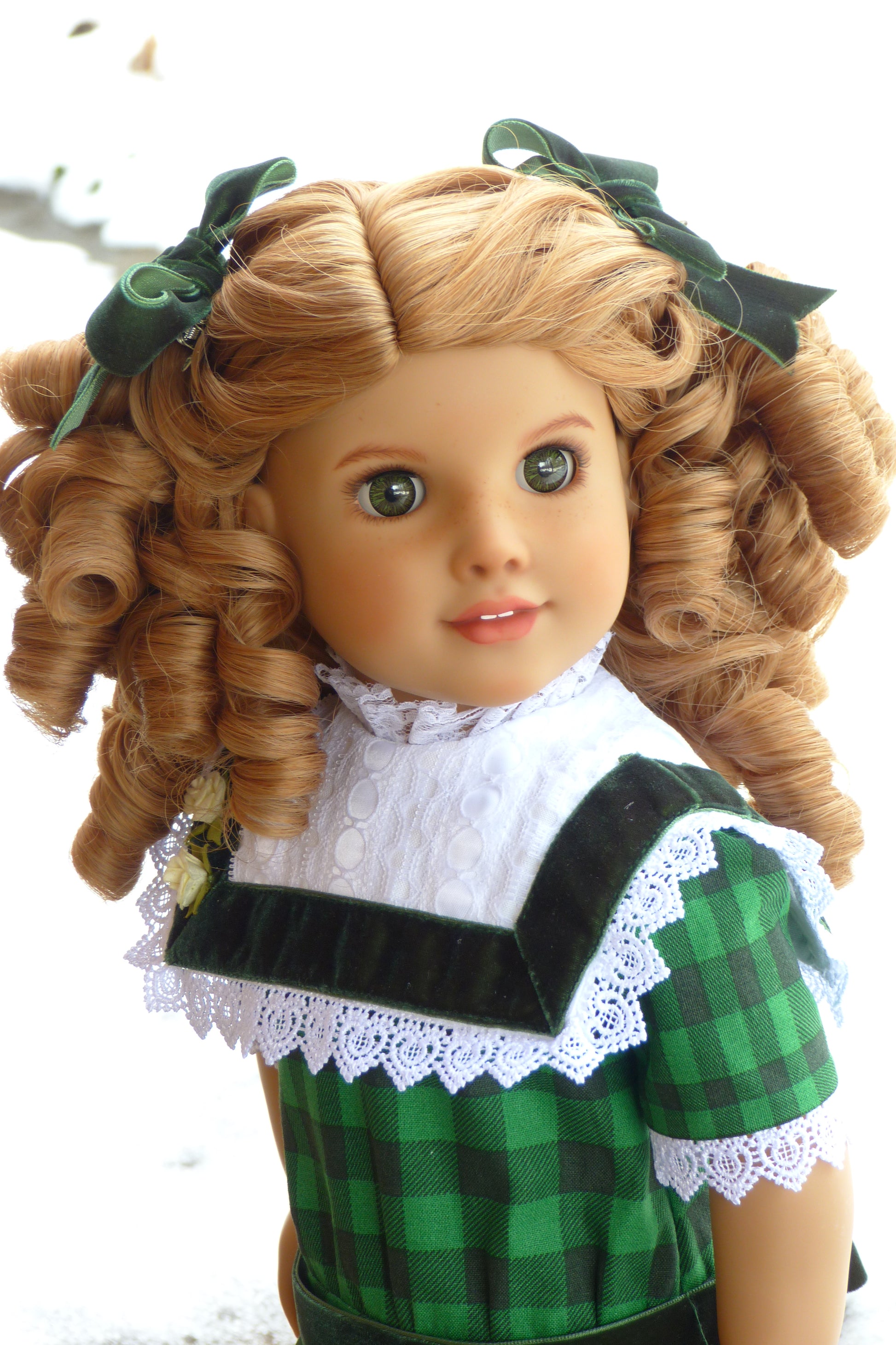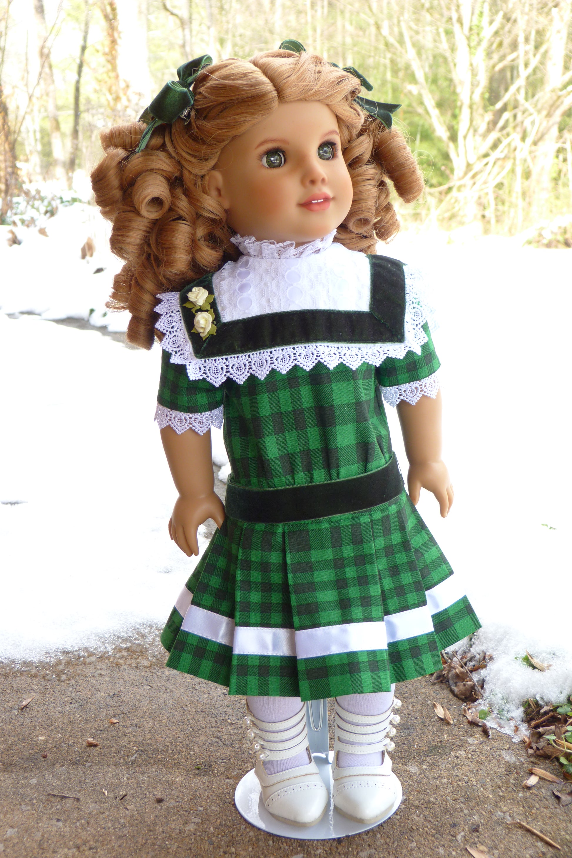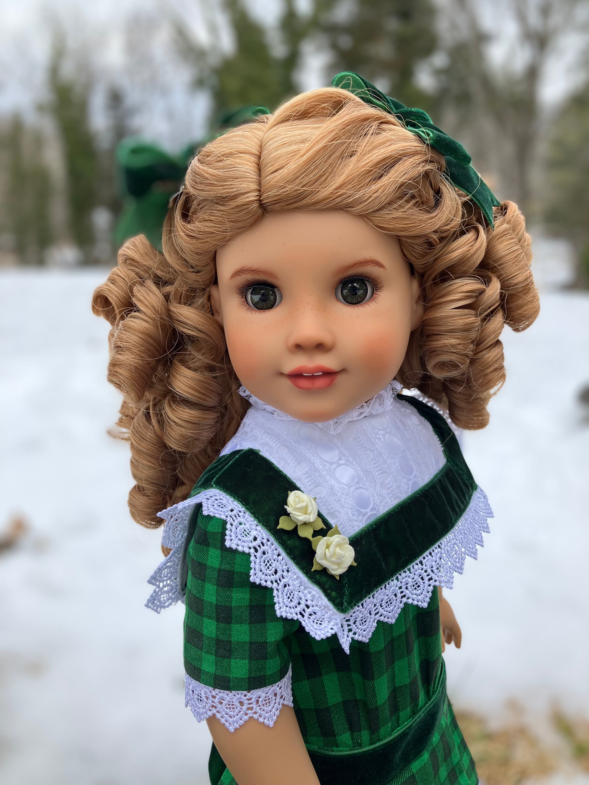 Erin will arrive in her handmade historical outfit, designed especially for her. This ensemble includes green velvet hair bows, lacy collar, and deep green checkered dress with metal snap closure. Also included are her white cotton bloomers, stockings, and shoes.