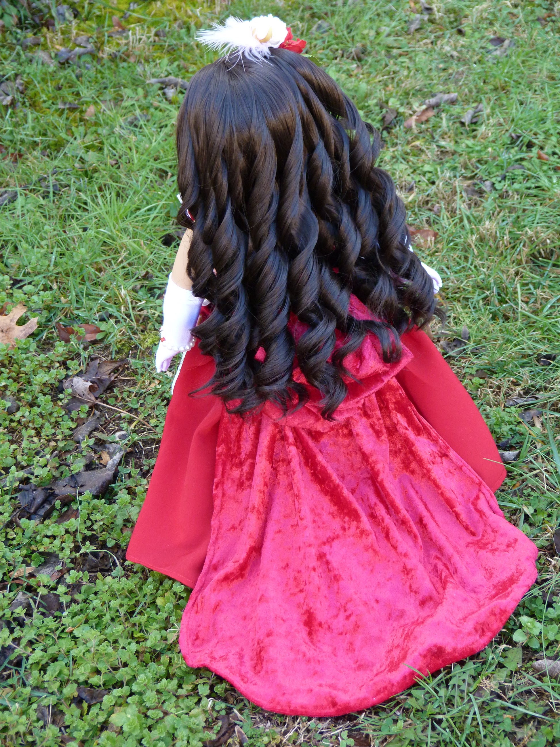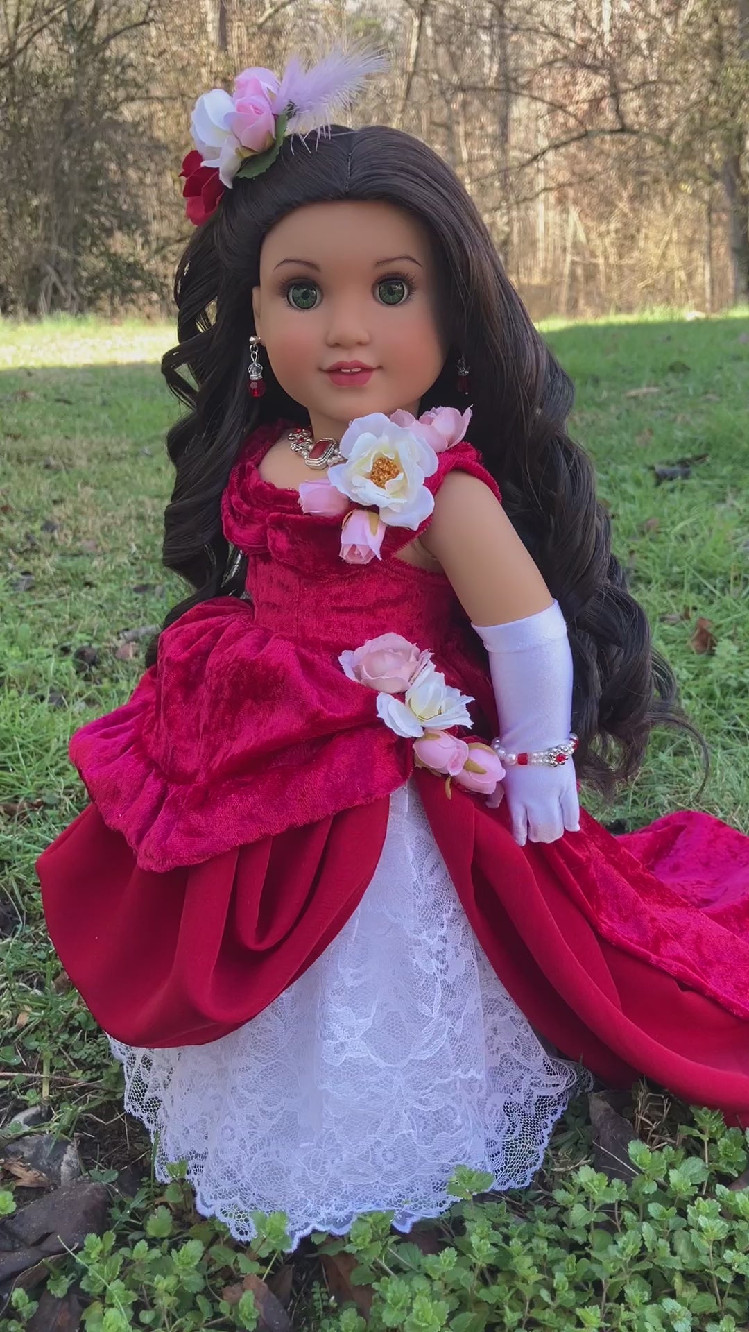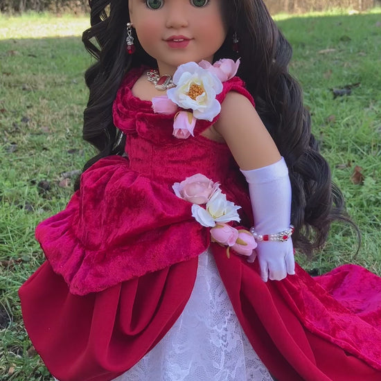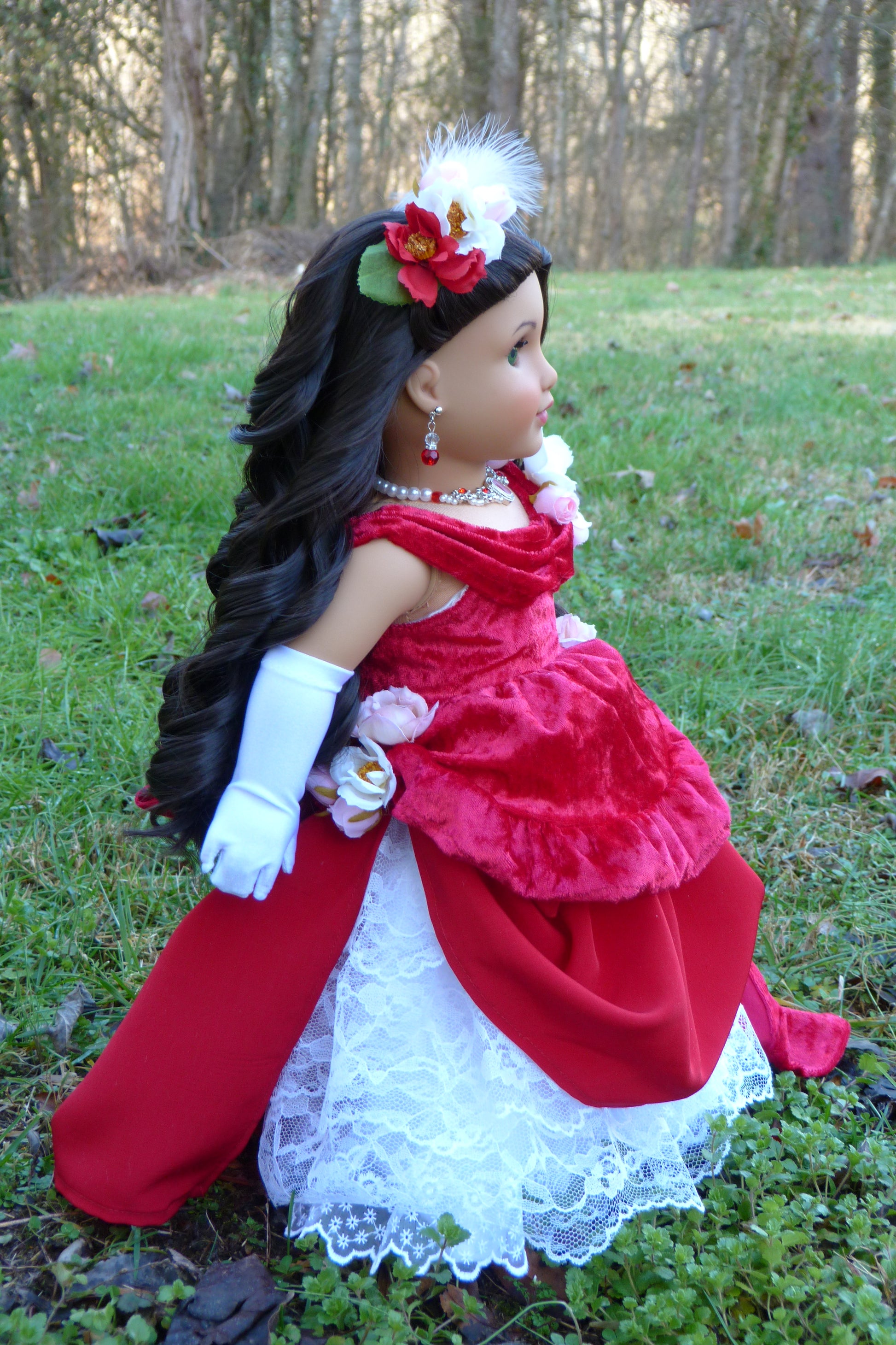 Valerie will arrive in her handmade Victorian style outfit, designed especially for her. This ensemble includes a floral feathered hair clip, velvety red and white lace gown with lining and hook/loop closure, white lycra gloves, white cotton pantaloons, stockings, and shoes. Her gorgeous ruby crystal jewelry was created by talented Etsy artist: SataHaykushDesigns.