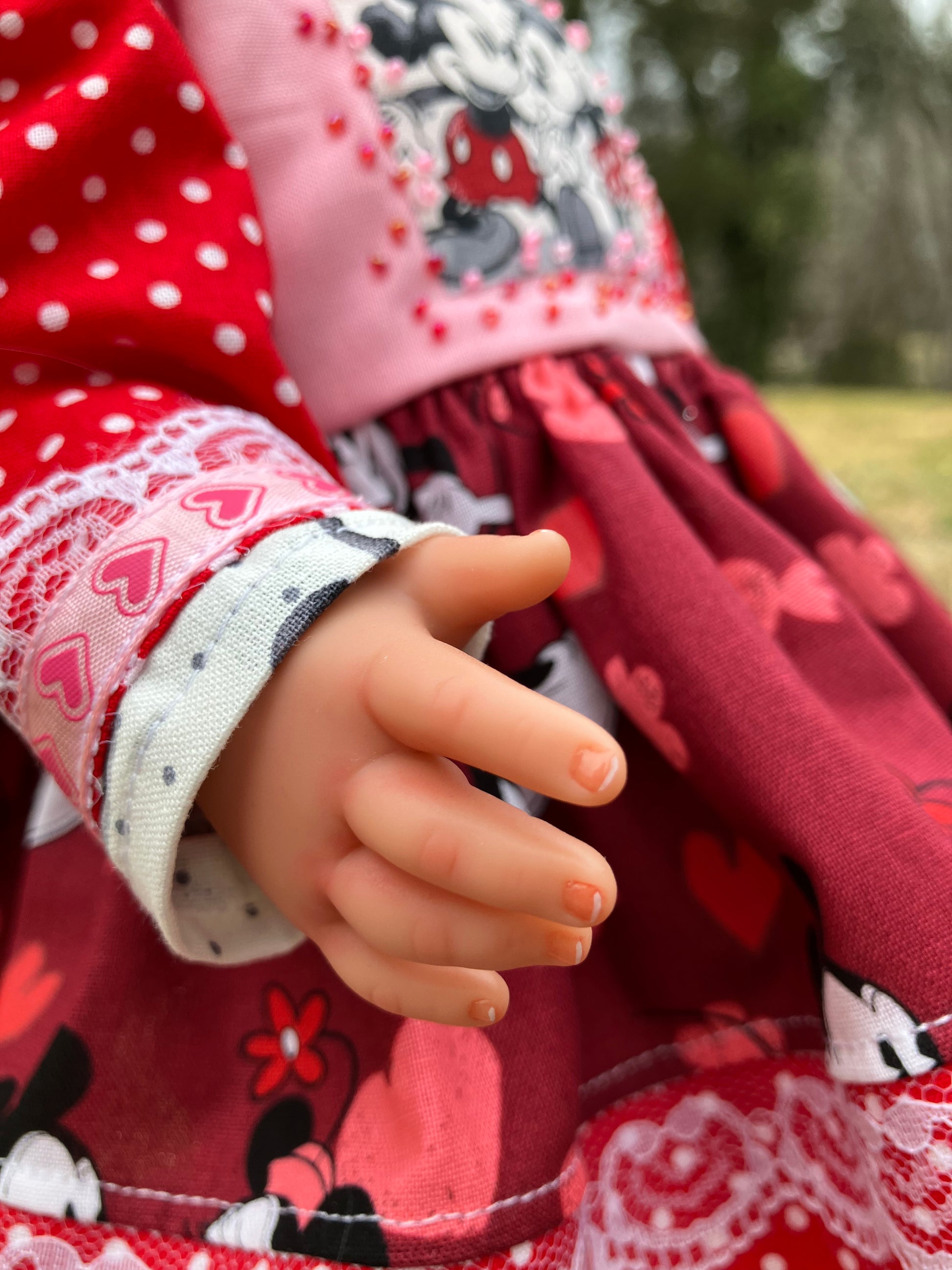 Veronica was created from a new 18 inch Kennedy and Friends doll. (Similar in size to American Girl dolls.) I have given her beautiful brown eyes and soft faux eyelashes. Acrylics and soft pastels were used to add feathered eyebrows, delicate eyelashes, lip shading, French manicure, pedicure, and skin blushing. Although all artwork has been sealed with MSC or Diamond Glaze, this doll should be handled gently.