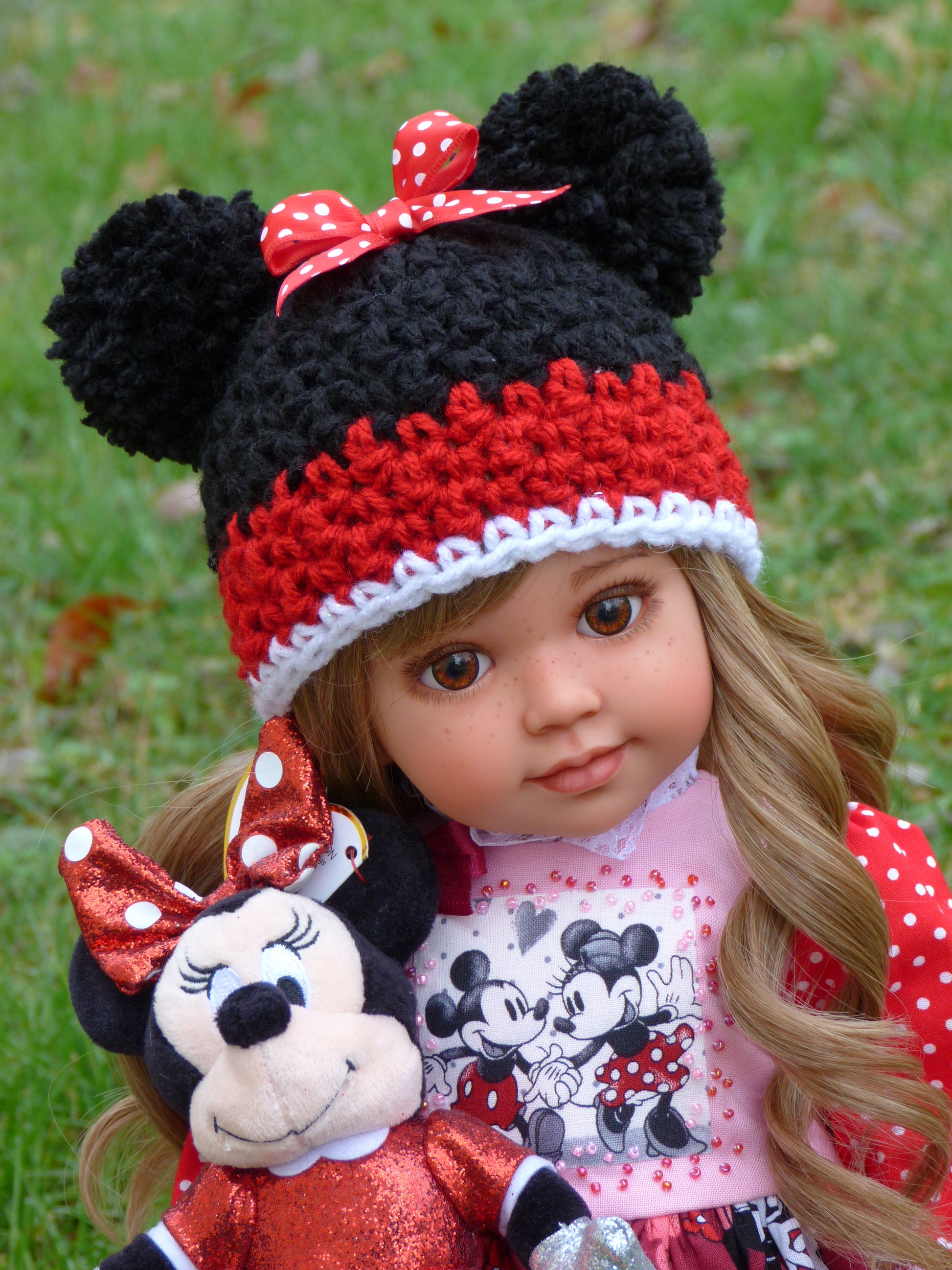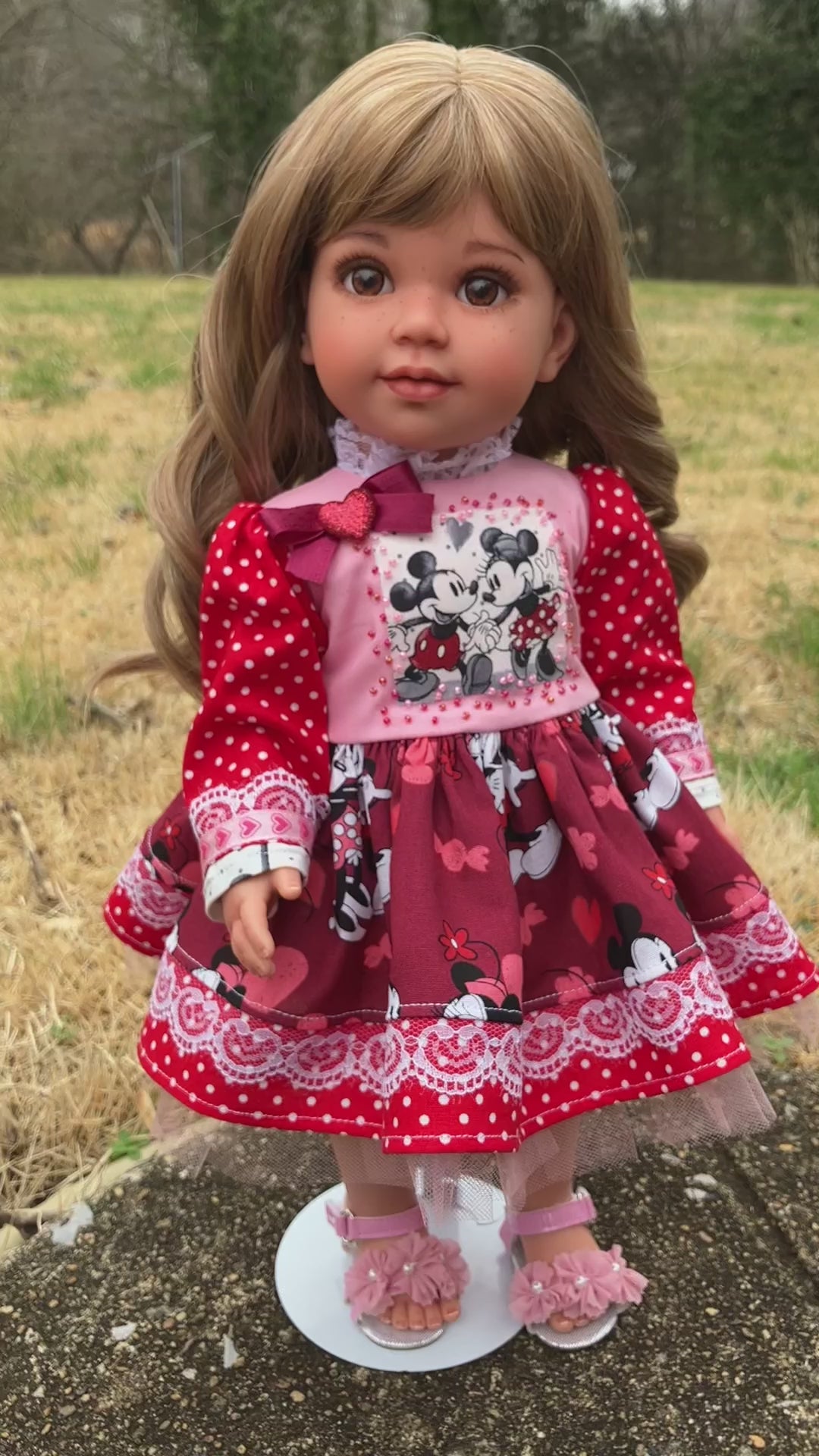She has a new custom taupe brown wig, designed by Dallas Doll Co. It has been permanently attached with craft contact adhesive and is heat-safe and tangle-resistant.