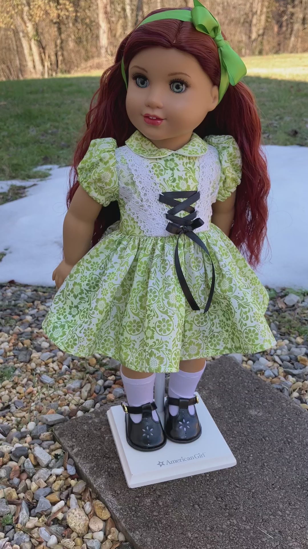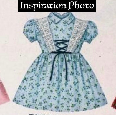 This handmade outfit is designed to fit 18 inch dolls such as AG. The style was inspired by a 1957 design. The dress is sewn of cotton and lace fabric. This dress has a fully-lined bodice, serged seams, and hook/loop closure. It has white trim and a lace up bodice. Her white socks are sewn of stretch knit fabric. The black T-strap shoes are by AFW and close with Velcro.