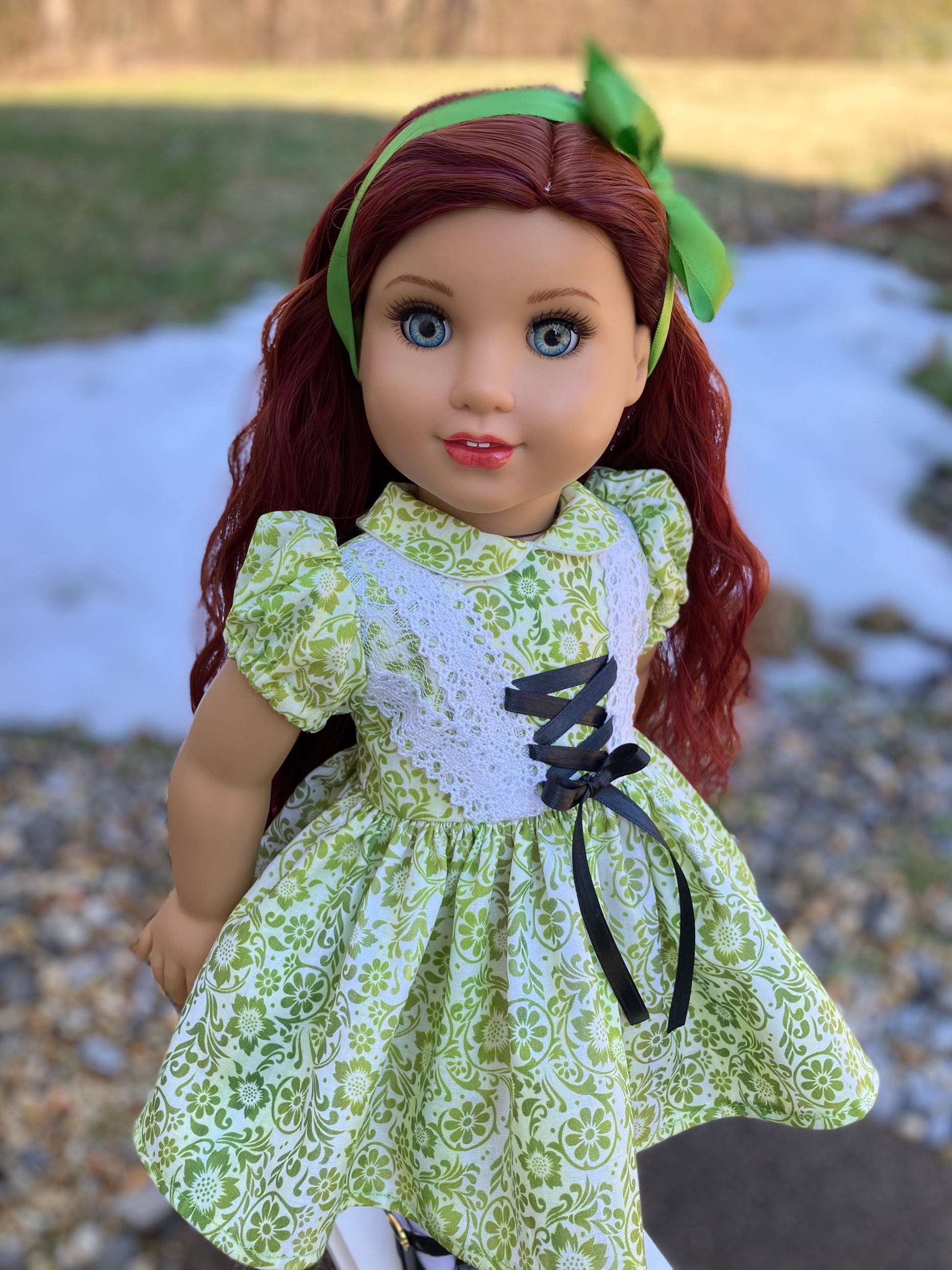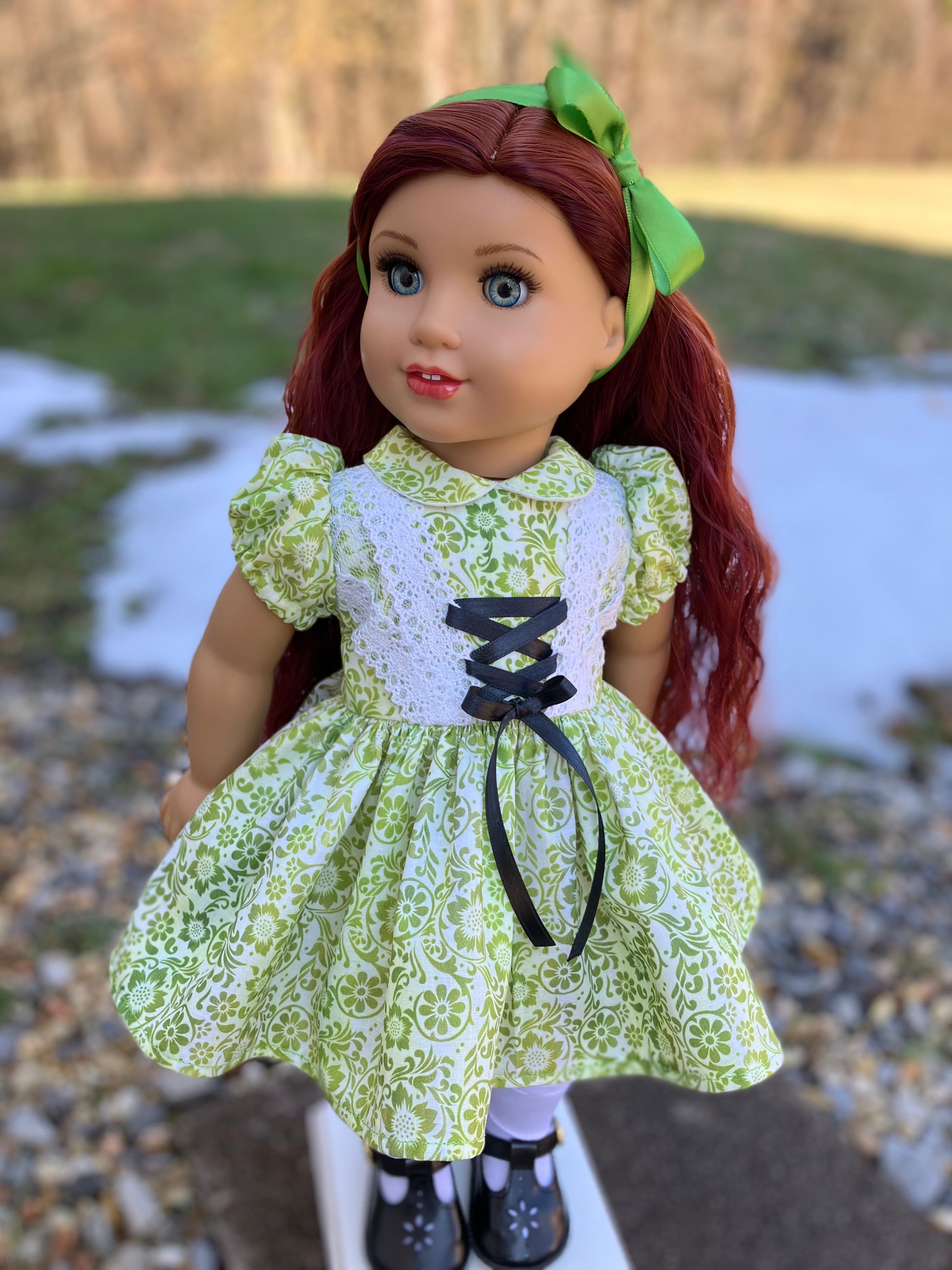 St. Patrick's Day Doll Ensemble: Hair Ribbon, Dress, Socks, & Shoes