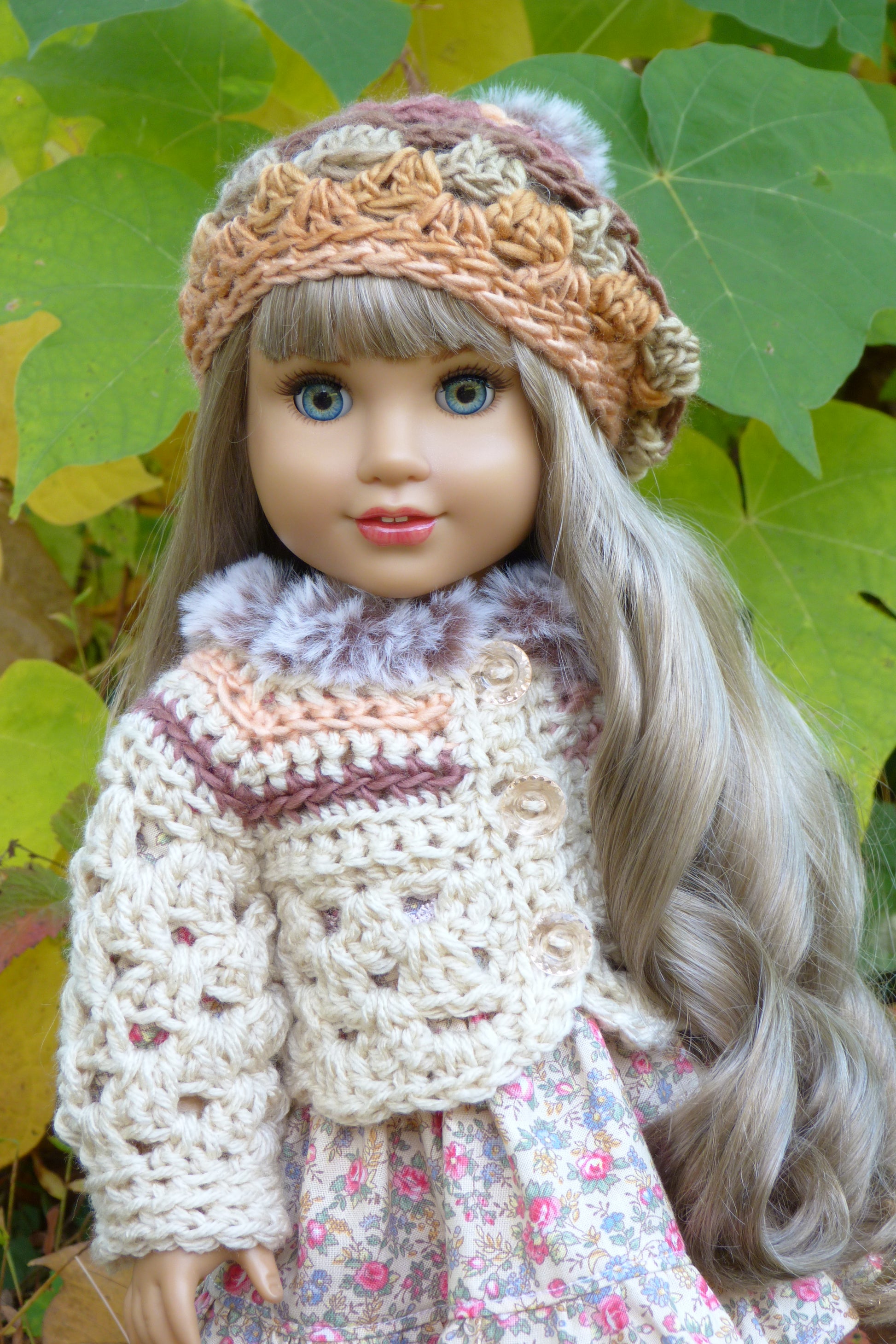 This handmade fall outfit is designed to fit 18 inch AG dolls. The hat and cardigan are crocheted of soft variegated and cream acrylic yarn. They are edged with faux fur. The dress is sewn of floral cotton fabric. It has serged seams, lace trim, and hook/loop closure in back. Cream ridged stretch knit fabric was sewn to create the socks. Her brown faux suede boots are made by American Fashion World.
