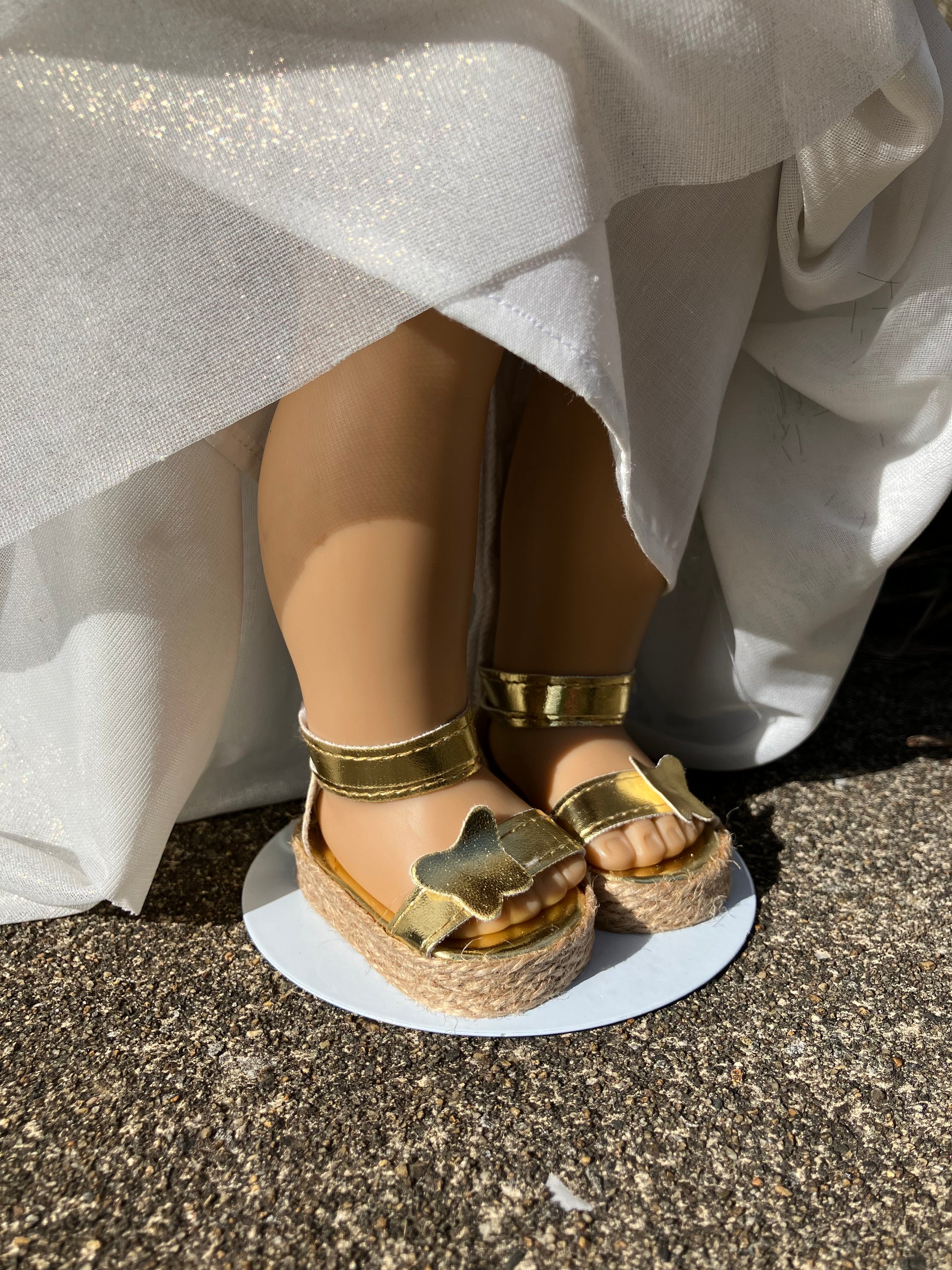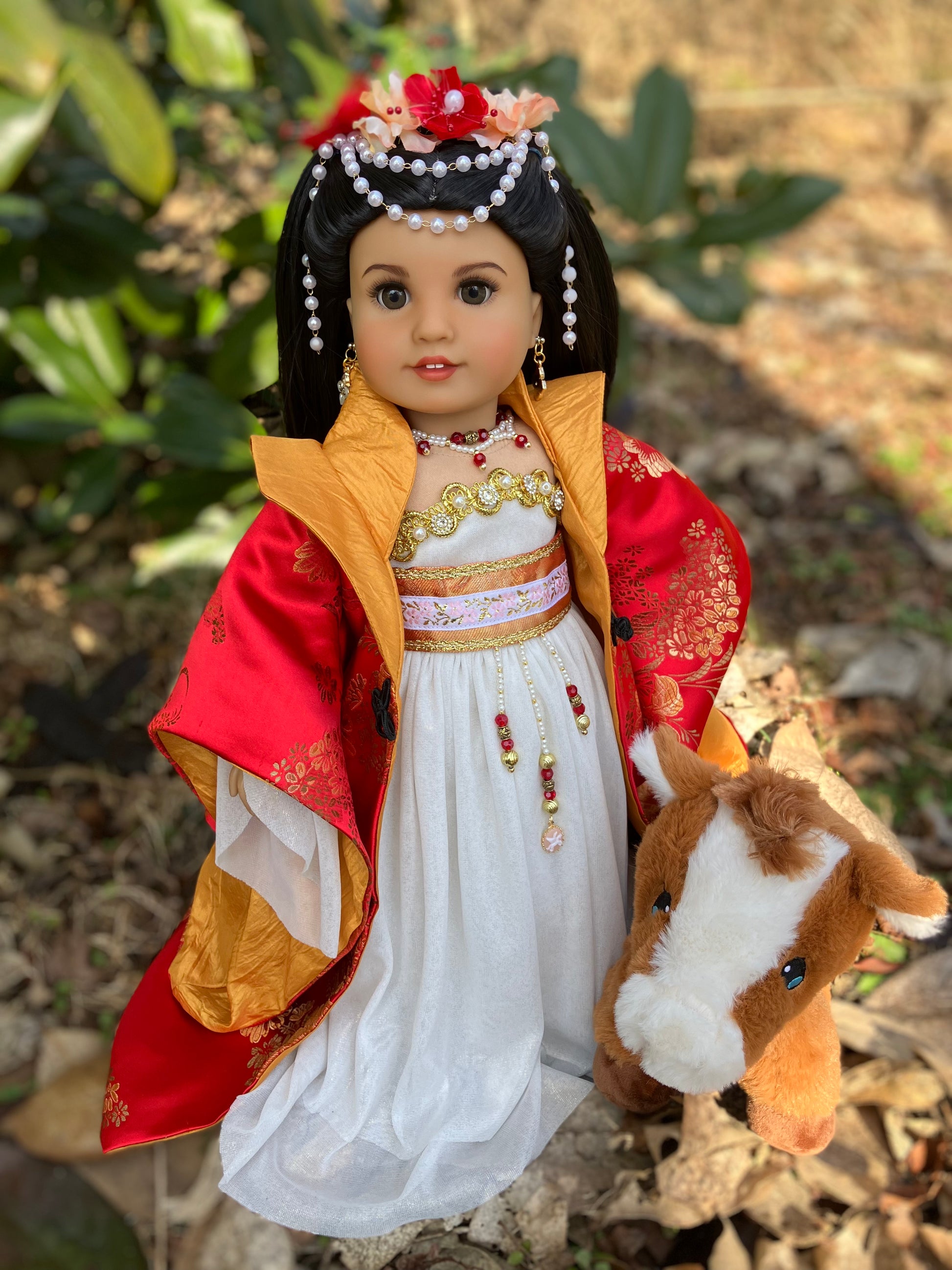 Mei will arrive in her handmade ensemble reflecting the lovely traditional Chinese hanfu dress style. The robe is sewn of a rich red satin brocade with golden flowers and lined in gold taffeta. The colors symbolize good fortune and prosperity. The shimmering white lower dress has metal snap closure in back. Her flowing separate sleeves are secured with elastic. The beaded belt ties in back with ribbon. Also included are her head piece, jewelry, and golden sandals. The beadwork incorporates premium Japanese gold beads, ruby red glass crystals, golden metal beads, and pearls. The necklace closes with a magnetic clasp.