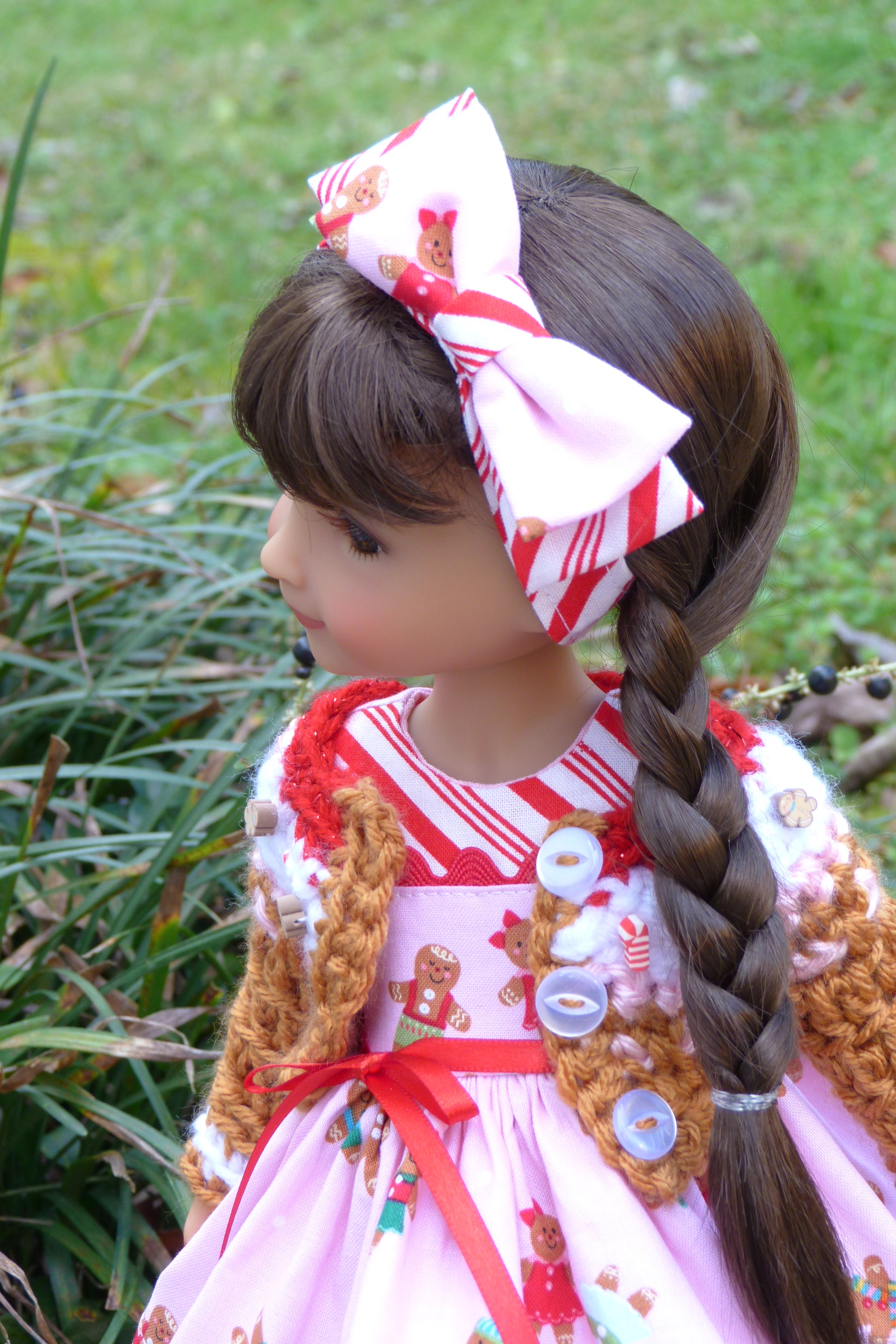 This ensemble is designed to fit Ruby Red Fashion Friends 14.5 inch dolls. The sweater is crocheted from soft acrylic yarn and decorated with millefiori beads. The cotton dress has serged seams, tulle underlay, and rear hook/loop closure. Her matching headband is secured with elastic. The tan socks are sewn of stretch knit fabric.