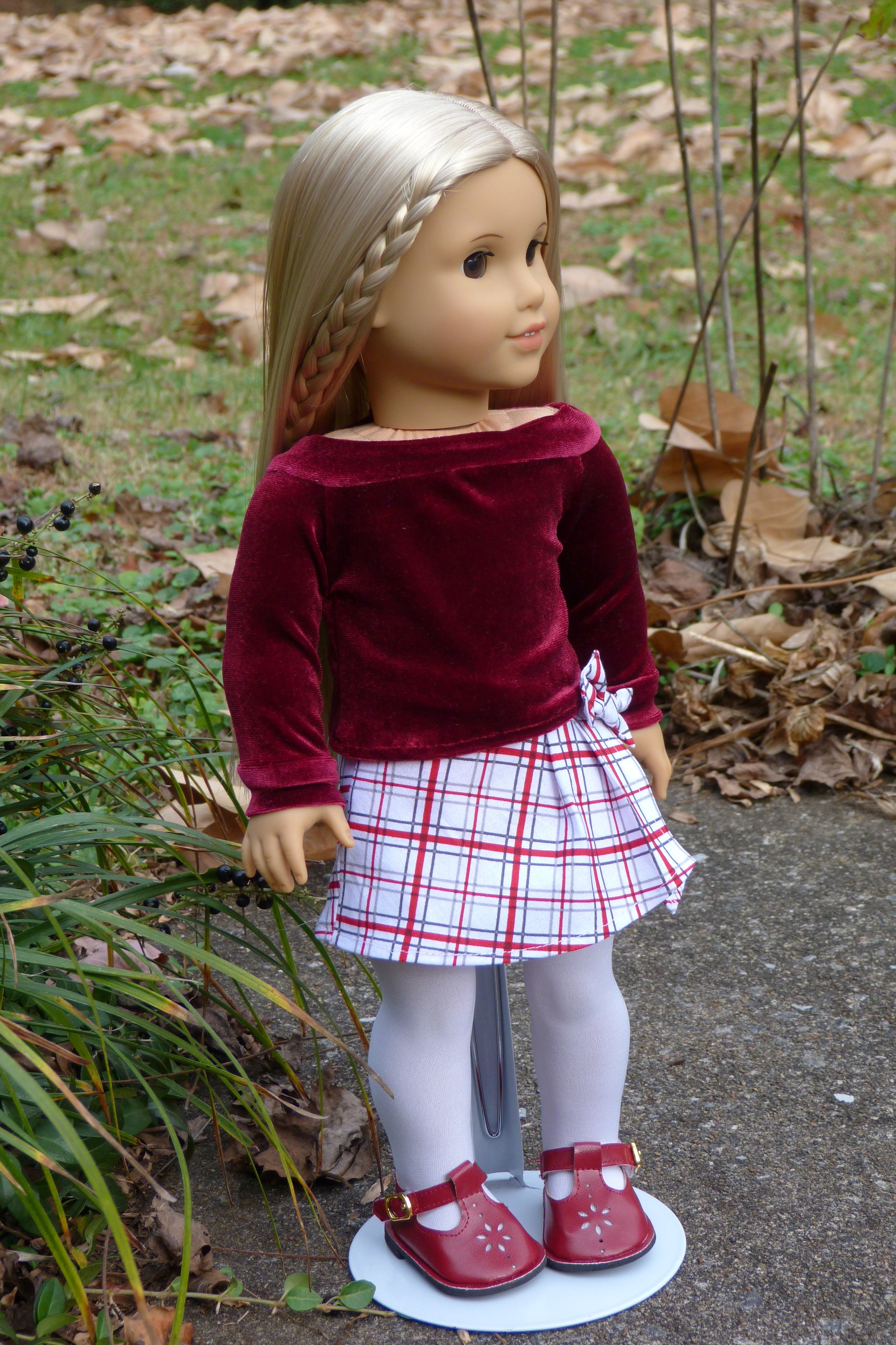 This handmade outfit is designed to fit 18 inch dolls such as AG. The velour boatneck top has hook and loop closure in back. The plaid cotton wrap skirt has serged seams and closes with metal snaps. The socks are sewn of white stretch knit fabric. Her shoes are by American Fashion World.