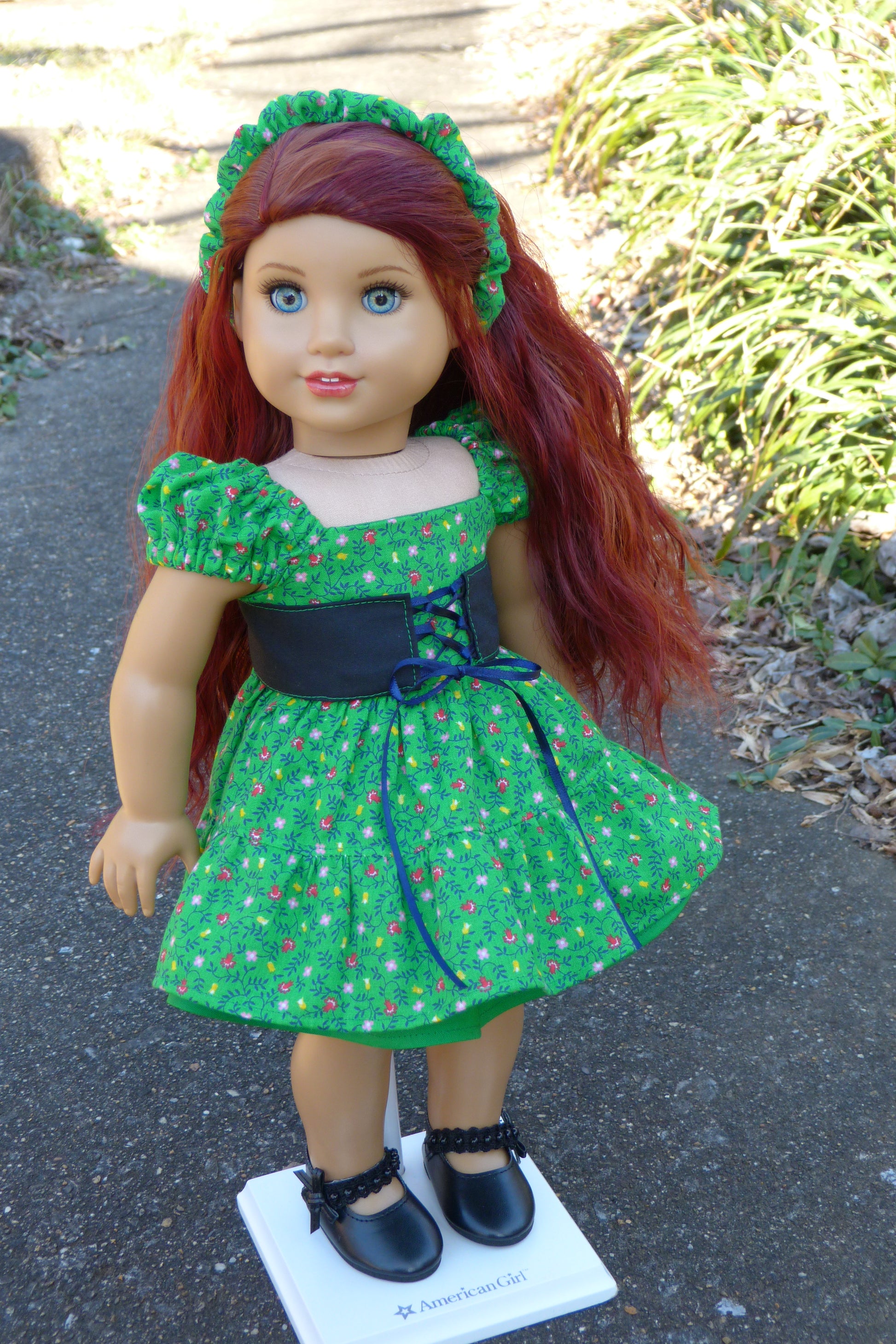 This handmade outfit is designed to fit 18 inch dolls such as AG. The style was inspired by a 1956 design. This cotton dress has a fully-lined bodice, serged seams, and metal snap closure. The corset laces up in front and has a metal snap in back. The cotton underskirt has an elastic waistband. Her black Mary Jane shoes are by AFW and close with Velcro.