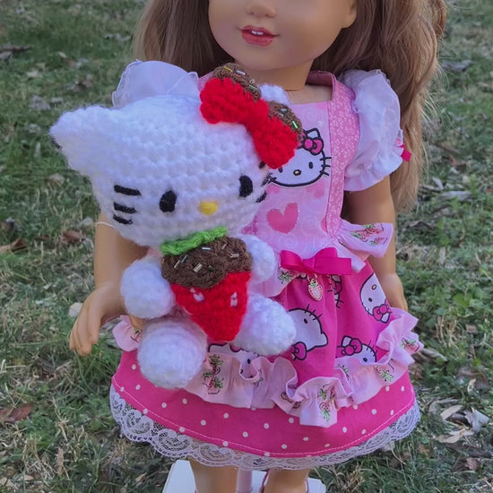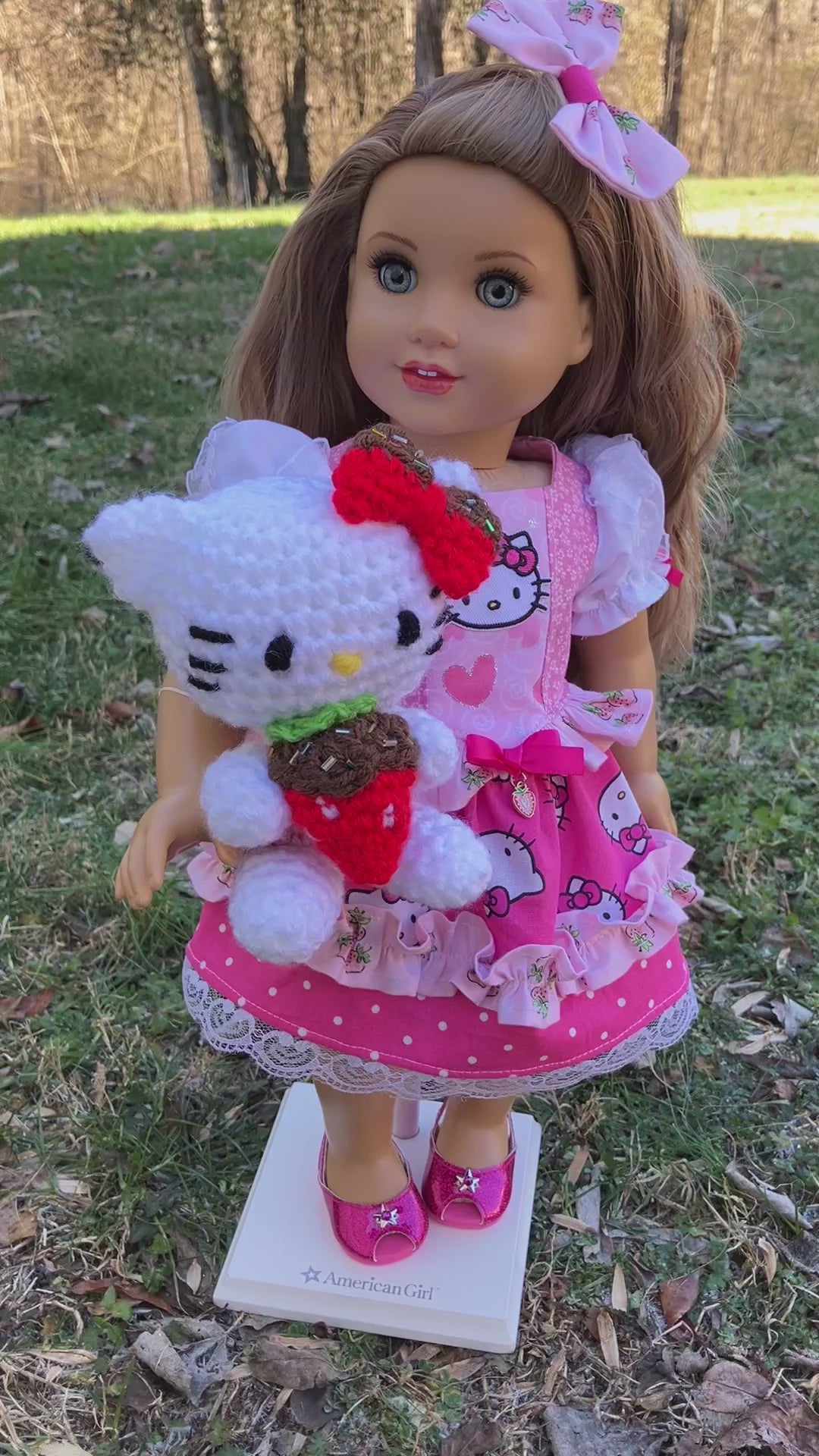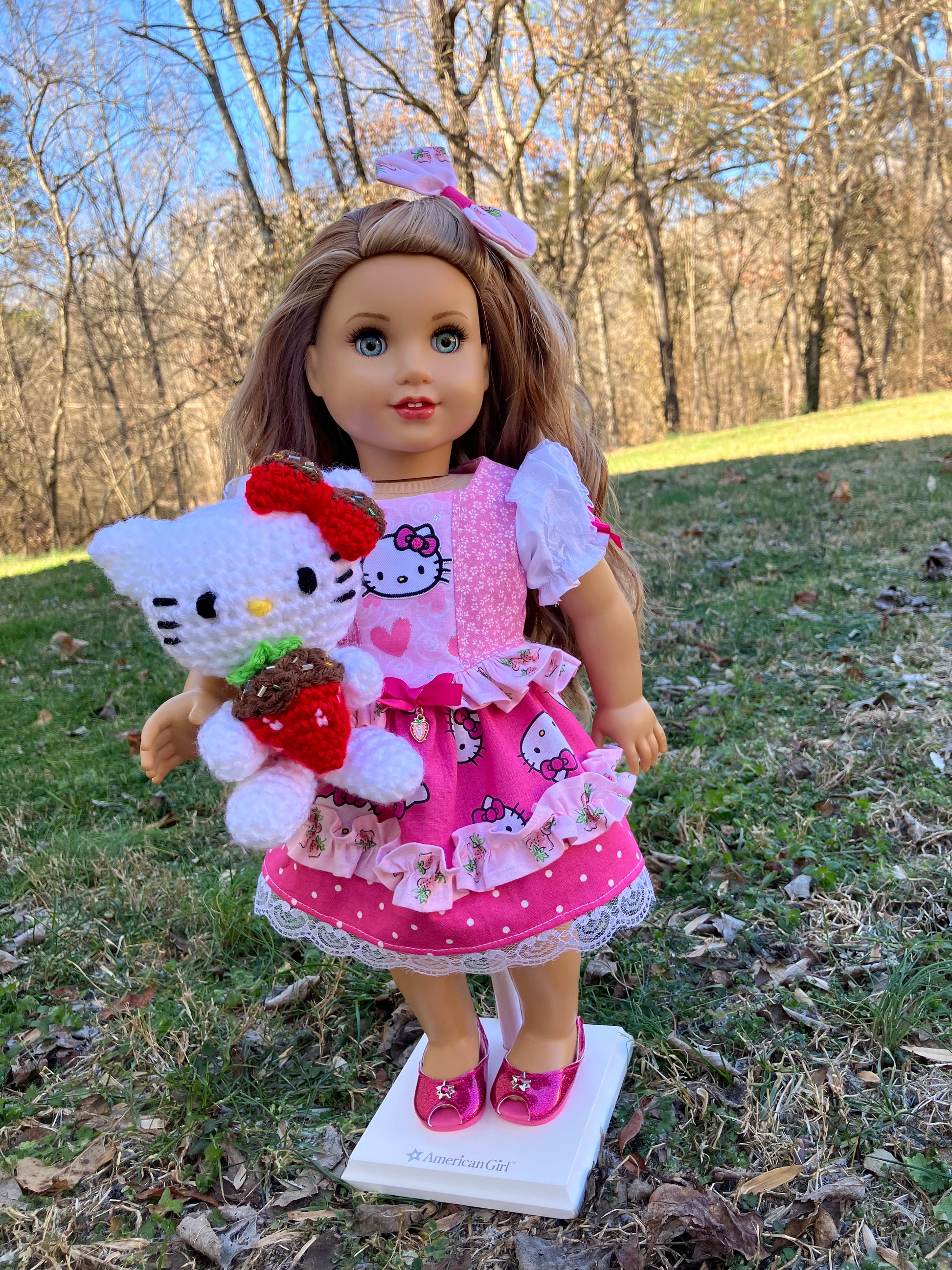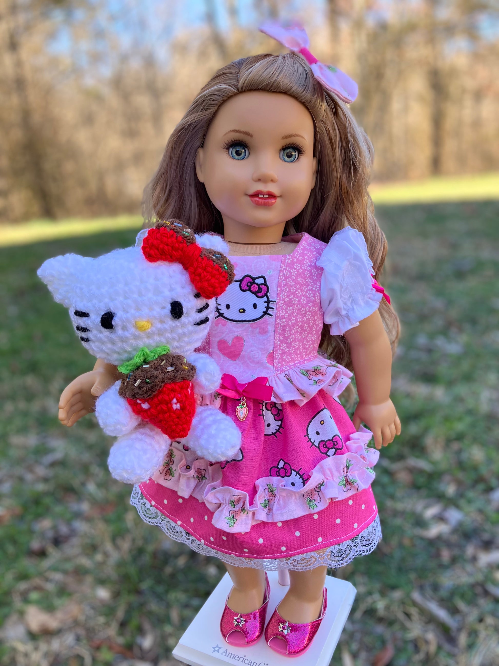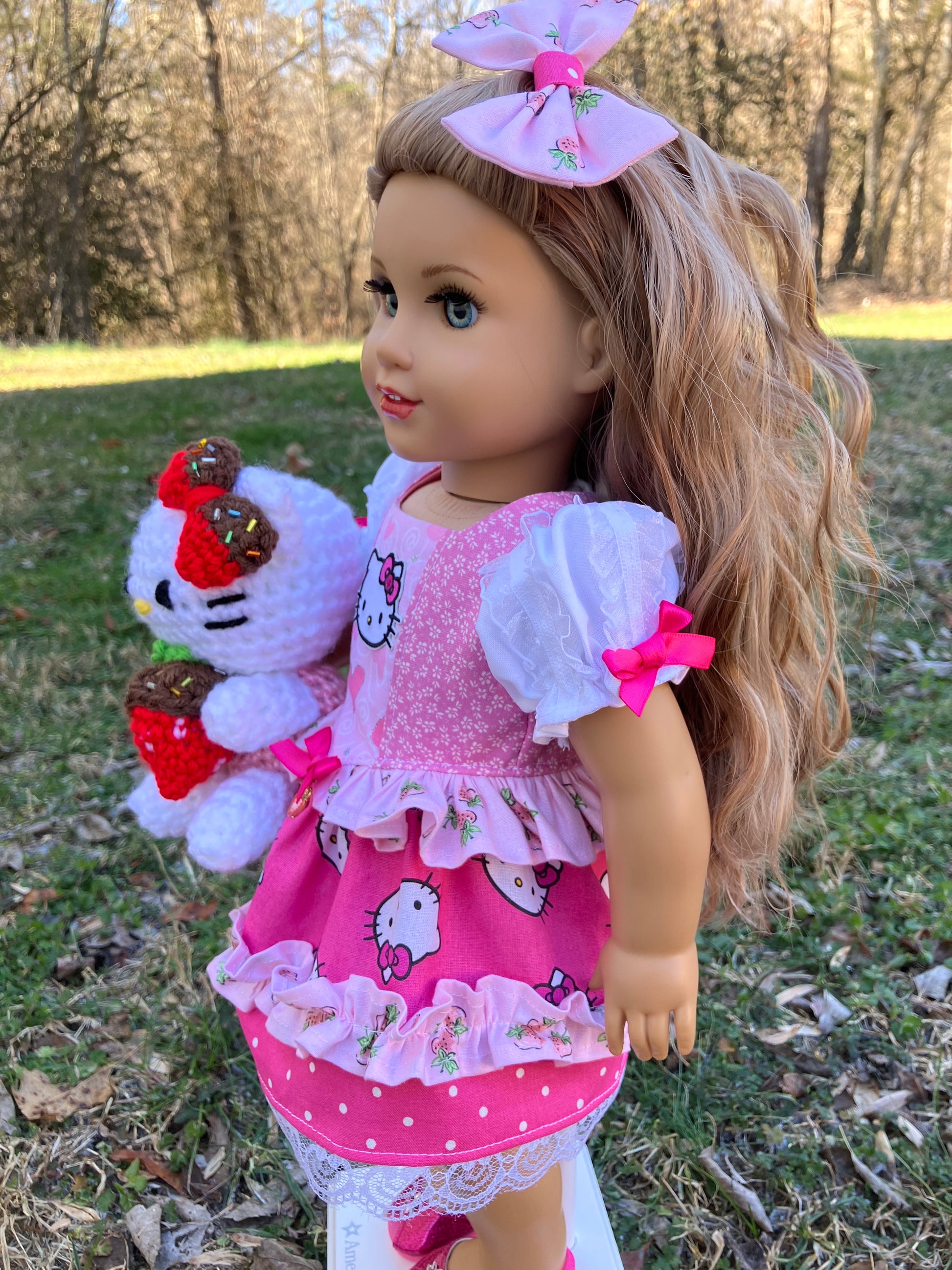 This handmade outfit is designed to fit 18 inch dolls such as AG. It is sewn of cotton fabric and decorated with organza trim, ribbon, a Hello Kitty applique, and strawberry charm dangle. This dress has a fully lined bodice, serged seams, and hook/loop closure. Her pink shoes are by American Girl.