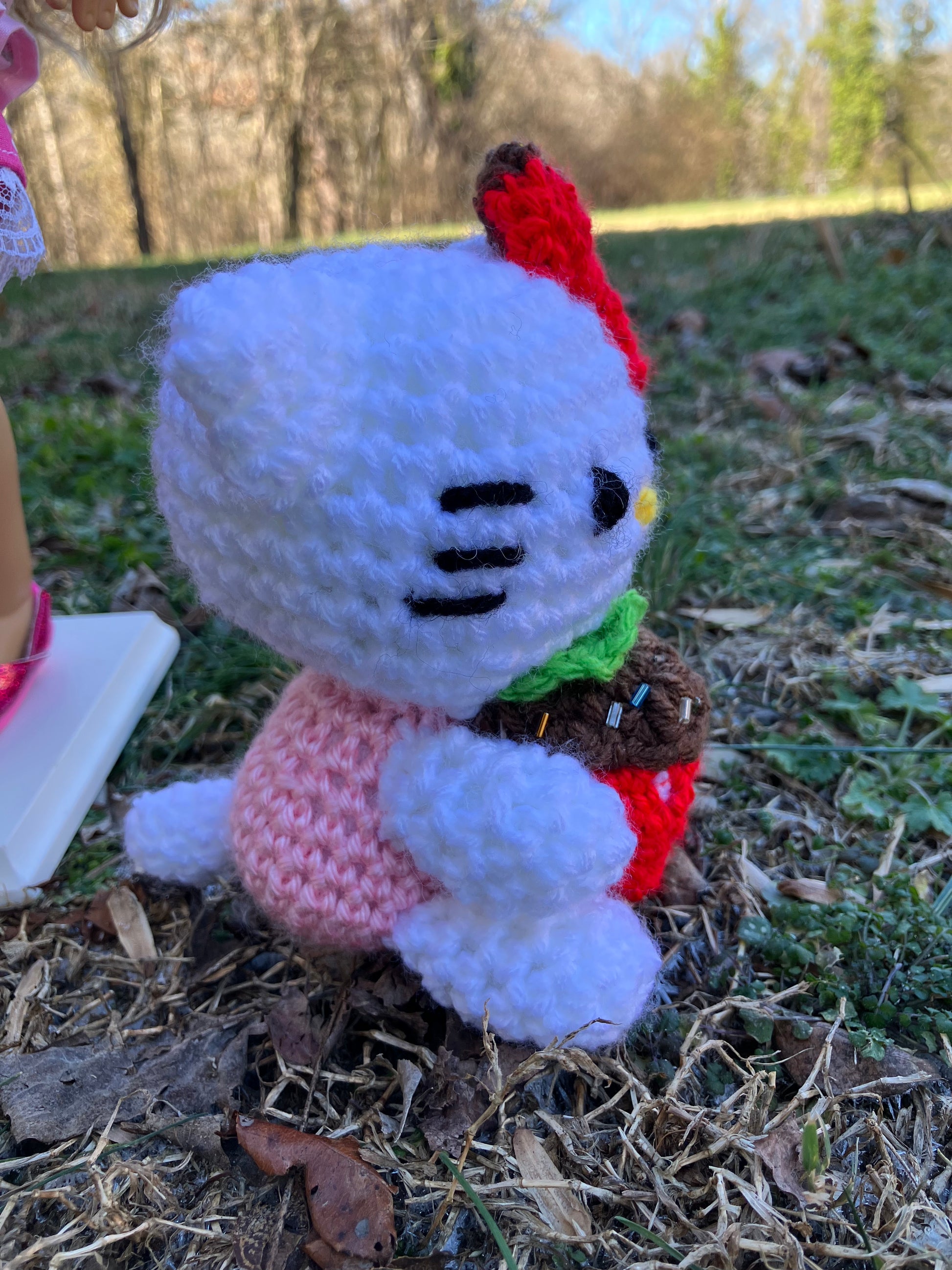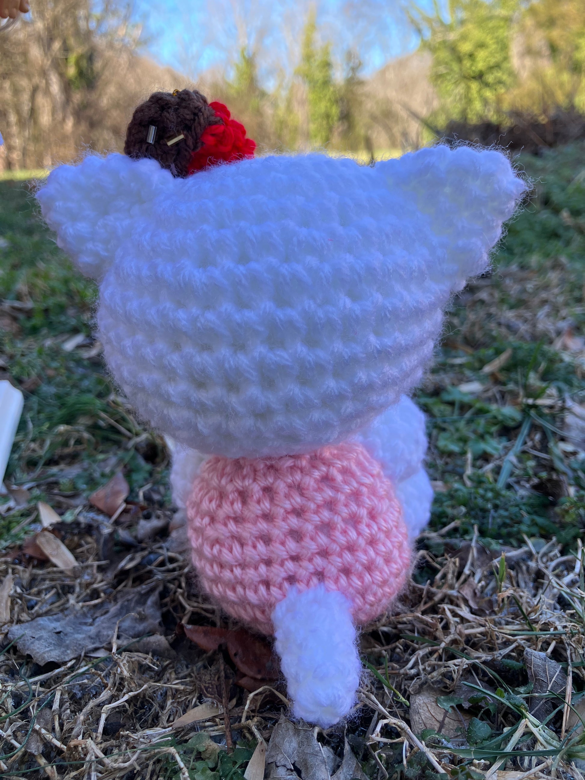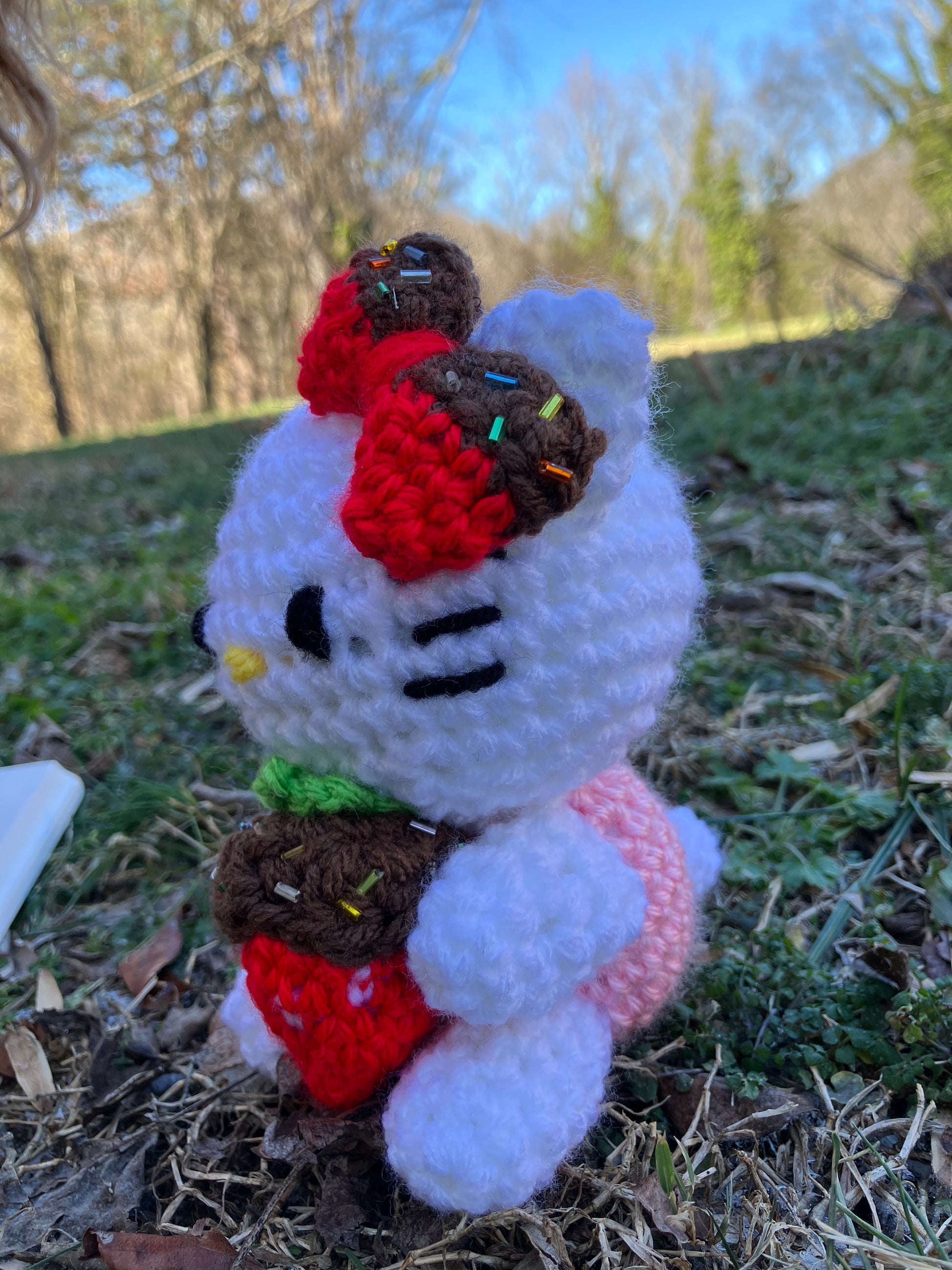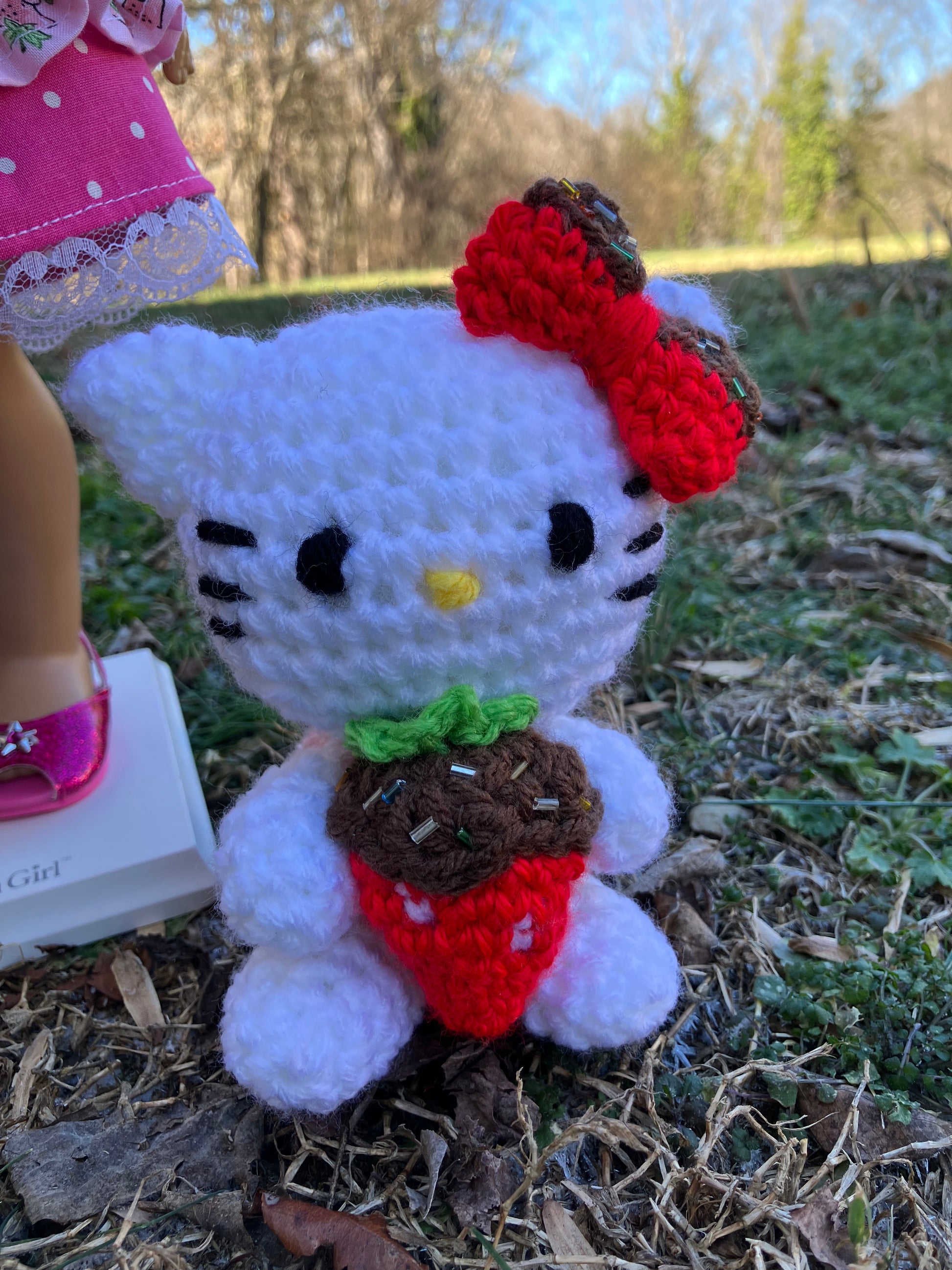 The amigurumi kitty is crocheted from soft acrylic yarn. The chocolate covered strawberry and her hair bow are decorated with colorful bugle bead sprinkles. This toy is stuffed with Poly-fil.