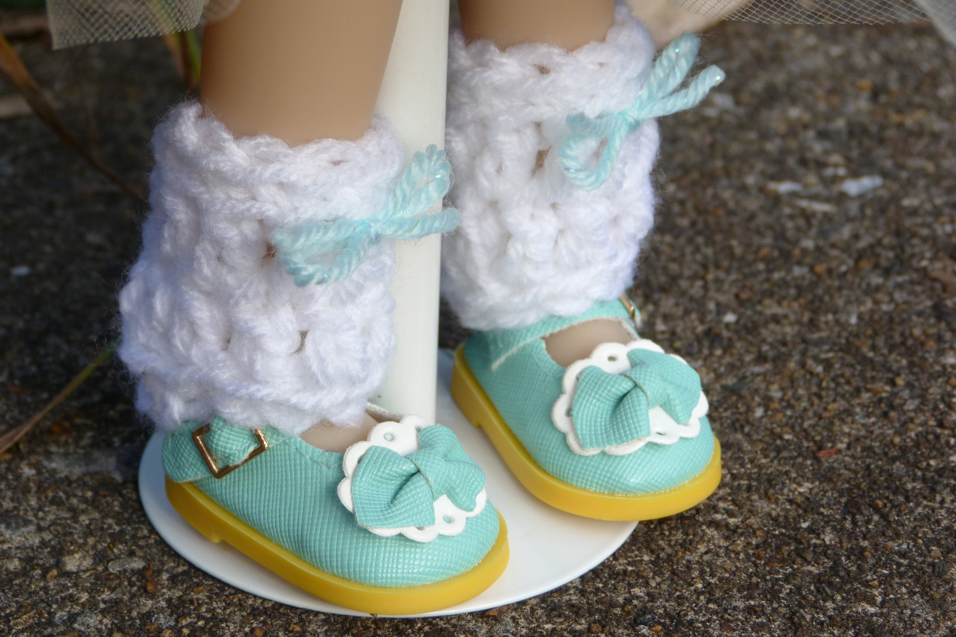 This ensemble is designed to fit Ruby Red Fashion Friends 14.5 inch dolls. The hat, sweater, scarf, and leg warmers are crocheted from soft acrylic yarn and faux fur. Ribbon, lace, and buttons adorn this set. The cotton layered skirt has serged seams, tulle underlay, and an elastic waistband. The aqua and white bow shoes close with Velcro.